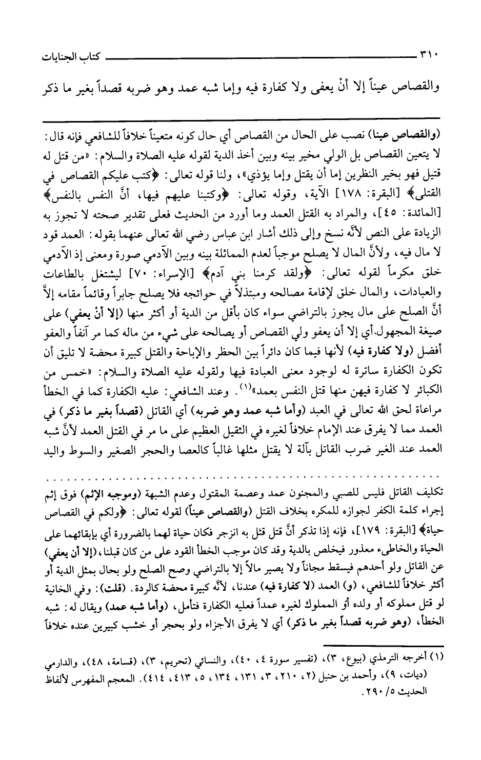 والقصاص عينا نصب على الحال من القصاص أي حال كونه متعينا خلافا للشافعي فإنه قال لا يتعين القصاص بل الولي مخير بينه وبين أخذ الدية لقوله عليه الصلاة والسلام من قتل له قتيل فهو بخير النظرين إما أن يقتل وإما يودى ولنا قوله تعالى كتب عليكم القصاص في القتلى الآية وقوله تعالى وكتبنا عليهم فيها أن النفس بالنفس والمراد به القتل العمد وما أورده من الحديث فعلى تقدير صحته لا تجوز به الزيادة على النص لأنه نسخ وإلى ذلك أشار ابن عباس رضي الله تعالى عنهما بقوله العمد قود لا مال فيه ولأن المال لا يصلح موجبا لعدم المماثلة بينه وبين الآدمي صورة ومعنى إذ الآدمي خلق مكرما لقوله تعالى ولقد كرمنا بني آدم ليشتغل بالطاعات والعبادات والمال خلق لإقامة مصالحه ومبتذلا في حوائجه فلا يصلح جابرا وقائما مقامه إلا أن الصلح على مال يجوز بالتراضي سواء كان بأقل من الدية أو أكثر منها إلا أن يعفى على صيغة المجهول أي إلا أن يعفو ولي القصاص أو يصالحه على شيء من ماله كما مر آنفا والعفو أفضل ولا كفارة فيه لأنها فيما كان دائرا بين الحظر والإباحة والقتل كبيرة محضة لا تليق أن تكون الكفارة ساترة له لوجود معنى العبادة فيها ولقوله عليه الصلاة والسلام خمس من الكبائر لا كفارة فيهن منها قتل النفس بعمد وعند الشافعي عليه الكفارة كما في الخطأ مراعاة لحق الله تعالى في العبد