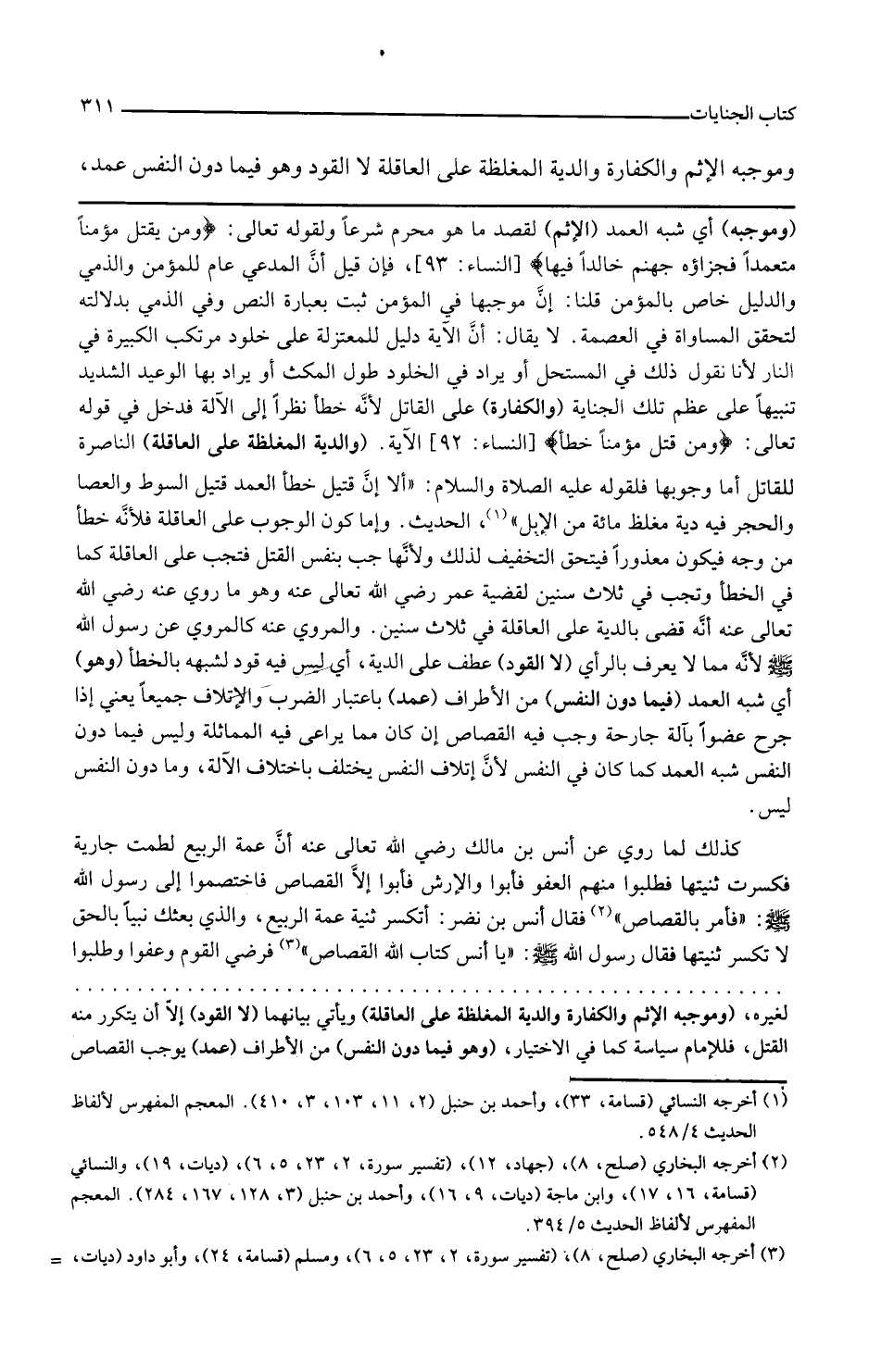 وموجبه أي شبه العمد الإثم لقصد ما هو محرم شرعا ولقوله تعالى ومن يقتل مؤمنا متعمدا فجزاؤه جهنم خالدا فيها فإن قيل إن المدعى عام للمؤمن والذمي والدليل خاص بالمؤمن قلنا إن موجبها في المؤمن ثبت بعبارة النص وفي الذمي بدلالته لتحقيق المساواة في العصمة لا يقال إن الآية دليل للمعتزلة على خلود مرتكب الكبيرة في النار لأنا نقول ذلك في المستحل أو يراد بالخلود طول المكث أو يراد بها الوعيد الشديد تنبيها على عظم تلك الجناية والكفارة على القاتل لأنه خطأ نظرا إلى الآلة فدخل في قوله تعالى ومن قتل مؤمنا خطأ الآية والدية المغلظة على العاقلة الناصرة للقاتل أما وجوبها فلقوله عليه الصلاة والسلام ألا إن قتيل خطأ العمد قتيل السوط والعصا والحجر فيه دية مغلظة مائة من الإبل الحديث وأما كون الوجوب على العاقلة فلأنه خطأ من وجه فيكون معذورا فيتحقق التخفيف لذلك ولأنها تجب بنفس القتل فتجب على العاقلة كما في الخطأ وتجب في ثلاث سنين لقضية عمر رضي الله تعالى عنه وهو ما روي عنه رضي الله تعالى عنه أنه قضى بالدية على العاقلة في ثلاث سنين والمروي عنه كالمروي عن رسول الله عليه الصلاة والسلام لأنه مما لا يعرف بالرأي لا القود عطف على الدية أي ليس فيه لشبهة بالخطأ وهو أي شبه العمد فيما دون النفس من الأطراف عمد باعتبار الضرب والإتلاف جميعا يعني إذا جرح عضوا بآلة جارحة وجب فيه القصاص إن كان مما يراعى فيه