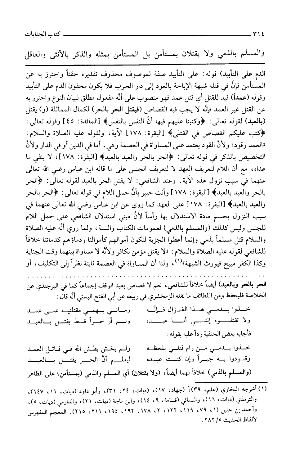 الدم على التأبيد قوله على التأبيد صفة لموصوف محذوف تقديره حقنا واحترز به عن المستأمن فإن في قتله شبهة الإباحة بالعود إلى دار الحرب فلا يكون محقون الدم على التأبيد وقوله عمدا قيد للقتل أي قتل عمد فهو منصوب على أنه مفعول مطلق لبيان النوع واحترز به عن القتل غير العمد فإنه لا يجب فيه القصاص فيقتل الحر بالحر لكمال المماثلة و يقتل بالعبد لقوله تعالى وكتبنا عليهم فيها أن النفس بالنفس وقوله تعالى كتب عليكم القصاص في القتلى الآية ولقوله عليه الصلاة والسلام العمد قود ولأن القود يعتمد على المساواة في العصمة وهي إما في الدين أو في الدار ولأن التخصيص بالذكر في قوله تعالى الحر بالحر والعبد بالعبد لا ينفي ما عداه مع أن اللام لتعريف العهد لا لتعريف الجنس على ما قاله ابن عباس رضي الله تعالى عنهما في سبب نزول هذه الآية وعند الشافعي لا يقتل الحر بالعبد لقوله تعالى الحر بالحر والعبد بالعبد وأنت خبير بأن حمل اللام في قوله تعالى الحر بالحر والعبد بالعبد على العهد كما روي عن ابن عباس رضي الله تعالى عنهما في سبب النزول يحسم مادة