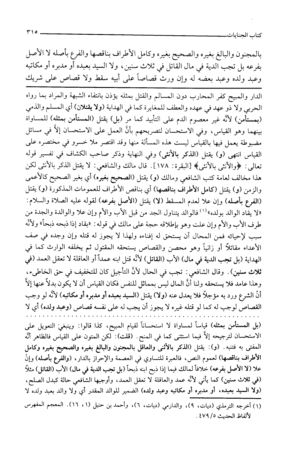 وفي النهاية وذكر صاحب الكشاف في تفسير قوله تعالى والأنثى بالأنثى قال مالك والشافعي لا يقتل الذكر بالأنثى لكن هذا مخالف لعامة كتب الشافعي ومالك و يقتل العاقل بالمجنون لا بعكسه و يقتل البالغ بغيره أي غير البالغ لا بعكسه أيضا و يقتل الصحيح بغيره أي بغير الصحيح كالأعمى والزمن و يقتل كامل الأطراف بناقصها أي بناقص الأطراف للعمومات المذكورة
