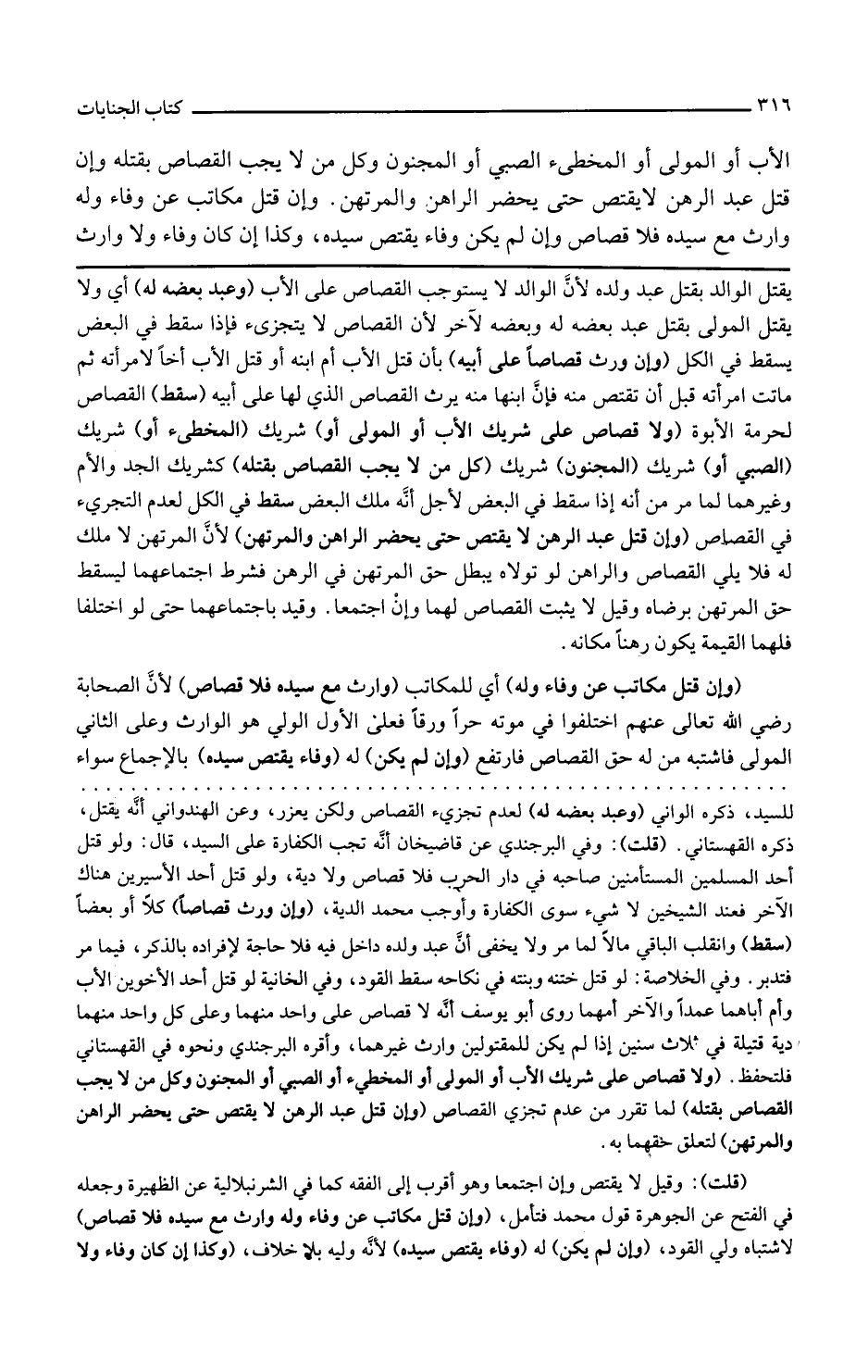وإن قتل مكاتب عن وفاء وله أي للمكاتب وارث مع سيده فلا قصاص لأن الصحابة رضي الله تعالى عنهم اختلفوا في موته حرا ورقا فعلى الأول الولي هو الوارث وعلى الثاني المولى فاشتبه من له حق القصاص فارتفع