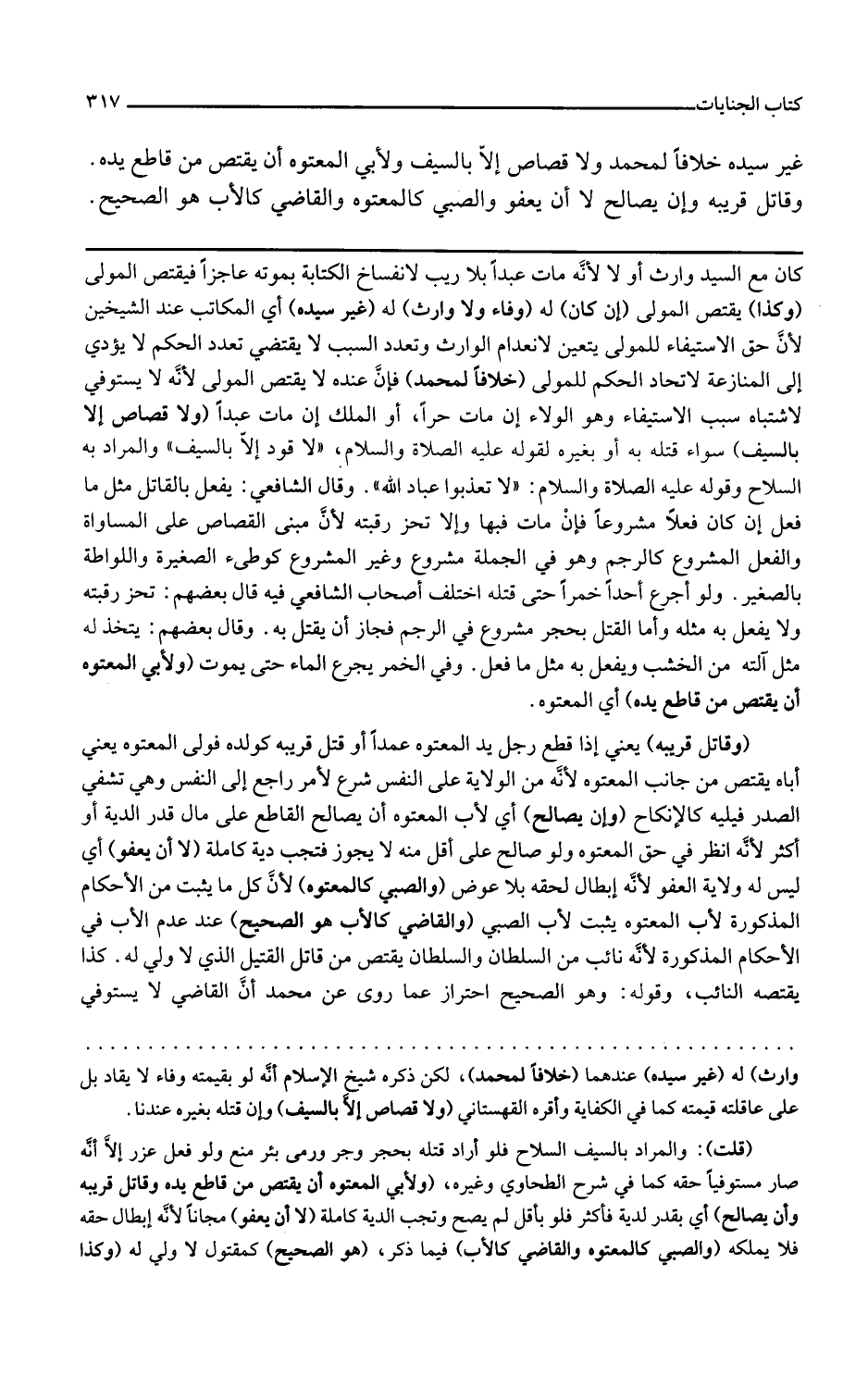 وكذا يقتص المولى إن كان له وفاء ولا وارث له غير سيده أي المكاتب عند الشيخين لأن حق الاستيفاء للمولى يتعين لانعدام الوارث وتعدد السبب لا يقتضي تعدد الحكم ولا يؤدي إلى المنازعة لاتحاد الحكم للمولى خلافا لمحمد فإن عنده لا يقتص المولى لأنه لا يستوفي لاشتباه سبب الاستيفاء وهو الولاء إن مات حرا أو الملك إن مات عبدا