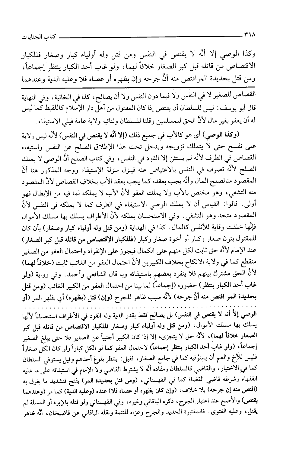 ومن قتل وله أولياء كبار وصغار بأن كان للمقتول بنون صغار وكبار أو إخوة صغار وكبار فللكبار الاقتصاص من قاتله قبل كبر الصغار عند الإمام لأنه حق ثابت لكل منهم على الكمال فيجوز على الانفراد واحتمال العفو من الصغير منقطع كما في ولاية الإنكاح بخلاف الكبيرين لأن احتمال العفو من الغائب ثابت خلافا لهما لأن الحق مشترك بينهم فلا ينفرد بعضهم باستيفائه وبه قال الشافعي وأحمد في رواية