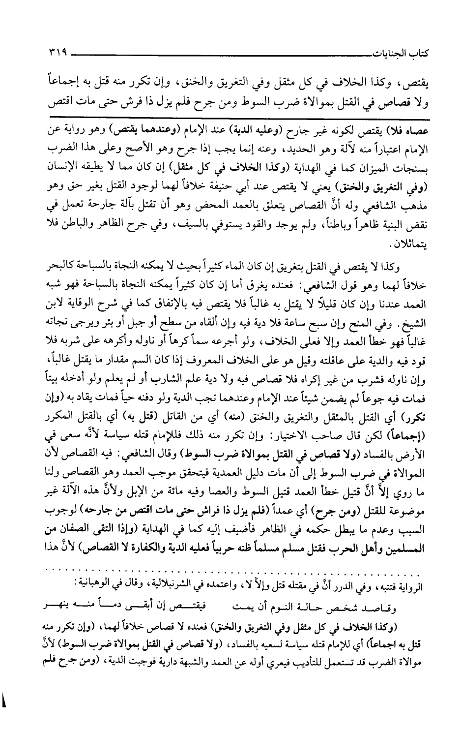 وكذا الخلاف في كل مثقل إن كان مما لا يطيقه الإنسان وفي التغريق والخنق يعني لا يقتص عند أبي حنيفة خلافا لهما لوجود القتل بغير حق وهو مذهب الشافعي وله أن القصاص يتعلق بالعمد المحض وهو أن تقتل بآلة جارحة تعمل في نقض البنية ظاهرا وباطنا ولم يوجد والقود يستوفى بالسيف وفيه جرح الظاهر والباطن فلا يتماثلان وكذا لا يقتص في القتل بتغريق إن كان الماء كثيرا بحيث لا يمكنه النجاة بالسباحة كالبحر خلافا لهما وهو قول الشافعي فعنده يغرق أما إن كان كثيرا يمكنه النجاة بالسباحة فهو شبه العمد عندنا وإن كان قليلا لا يقتل به غالبا فلا يقتص فيه بالاتفاق كما في شرح الوقاية لابن الشيخ