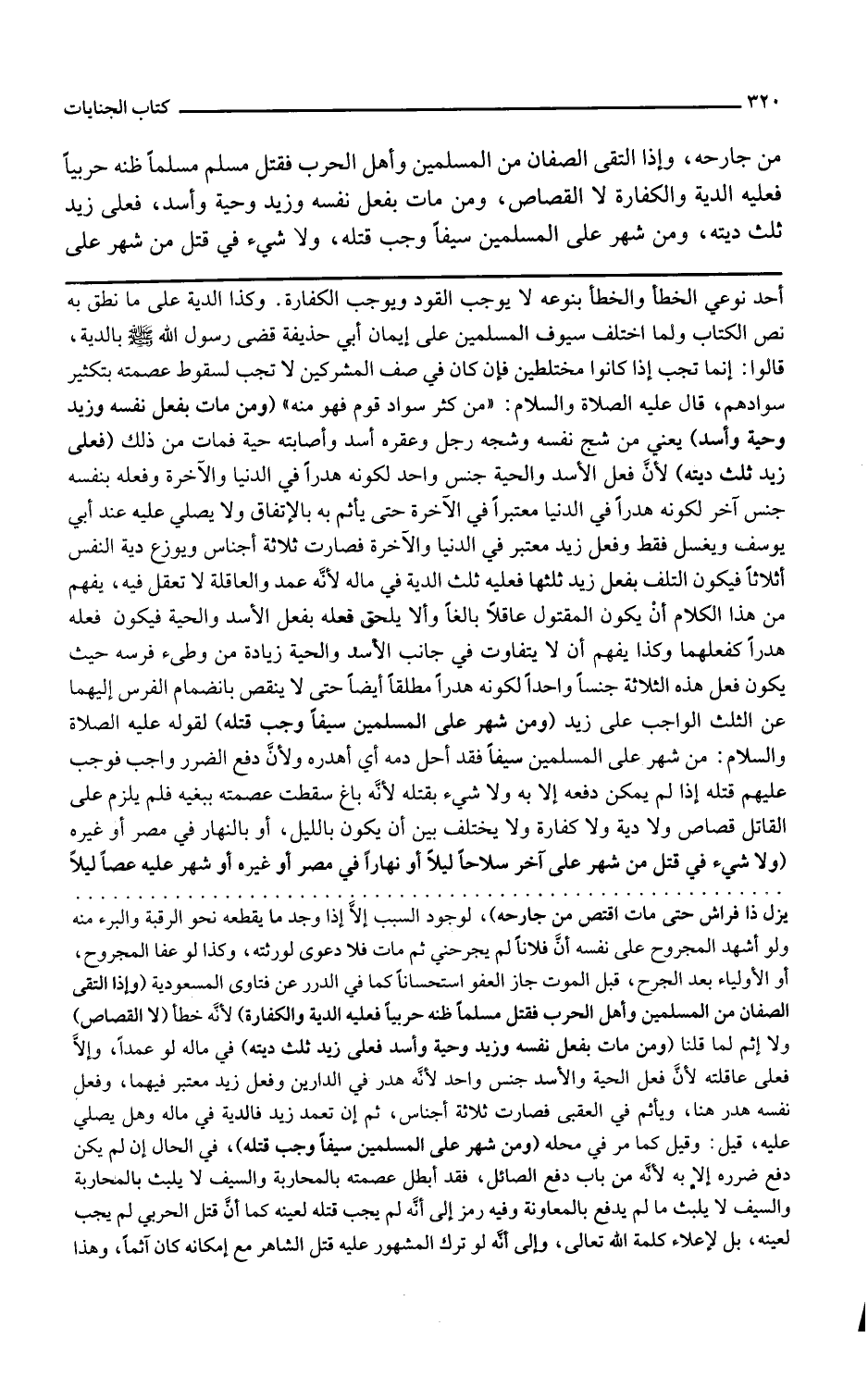حية فمات من ذلك فعلى زيد ثلث ديته لأن فعل الأسد والحية جنس واحد لكونه هدرا في الدنيا والآخرة وفعله بنفسه جنس آخر لكونه هدرا في الدنيا معتبرا في الآخرة حتى يأثم به بالاتفاق ولا يصلى عليه عند أبي يوسف ويغسل فقط وفعل زيد معتبر في الدنيا والآخرة فصارت ثلاثة أجناس ويوزع دية النفس أثلاثا فيكون التلف زيد ثلثها فعليه ثلث الدية في ماله لأنه عمد والعاقلة لا تعقل فيه يفهم من هذا الكلام أن يكون المقتول عاقلا بالغا وإلا يلحق فعله بفعل الأسد والحية فيكون فعله هدرا كفعلهما وكذا يفهم أن لا يتفاوت في جانب الأسد والحية زيادة من وطئ فرسه حيث يكون فعل هذه الثلاثة جنسا واحدا لكونه هدرا مطلقا أيضا حتى لا ينقص بانضمام الفرس إليهما عن الثلث الواجب على زيد