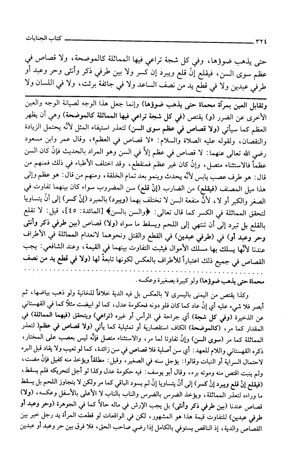 و يقتص في كل شجة تراعى فيها المماثلة كالموضحة وهي أن يظهر العظم كما سيأتي ولا قصاص في عظم سوى السن لتعذر استيفاء المثل لأنه يحتمل الزيادة والنقصان ولقوله عليه الصلاة والسلام لا قصاص في العظم