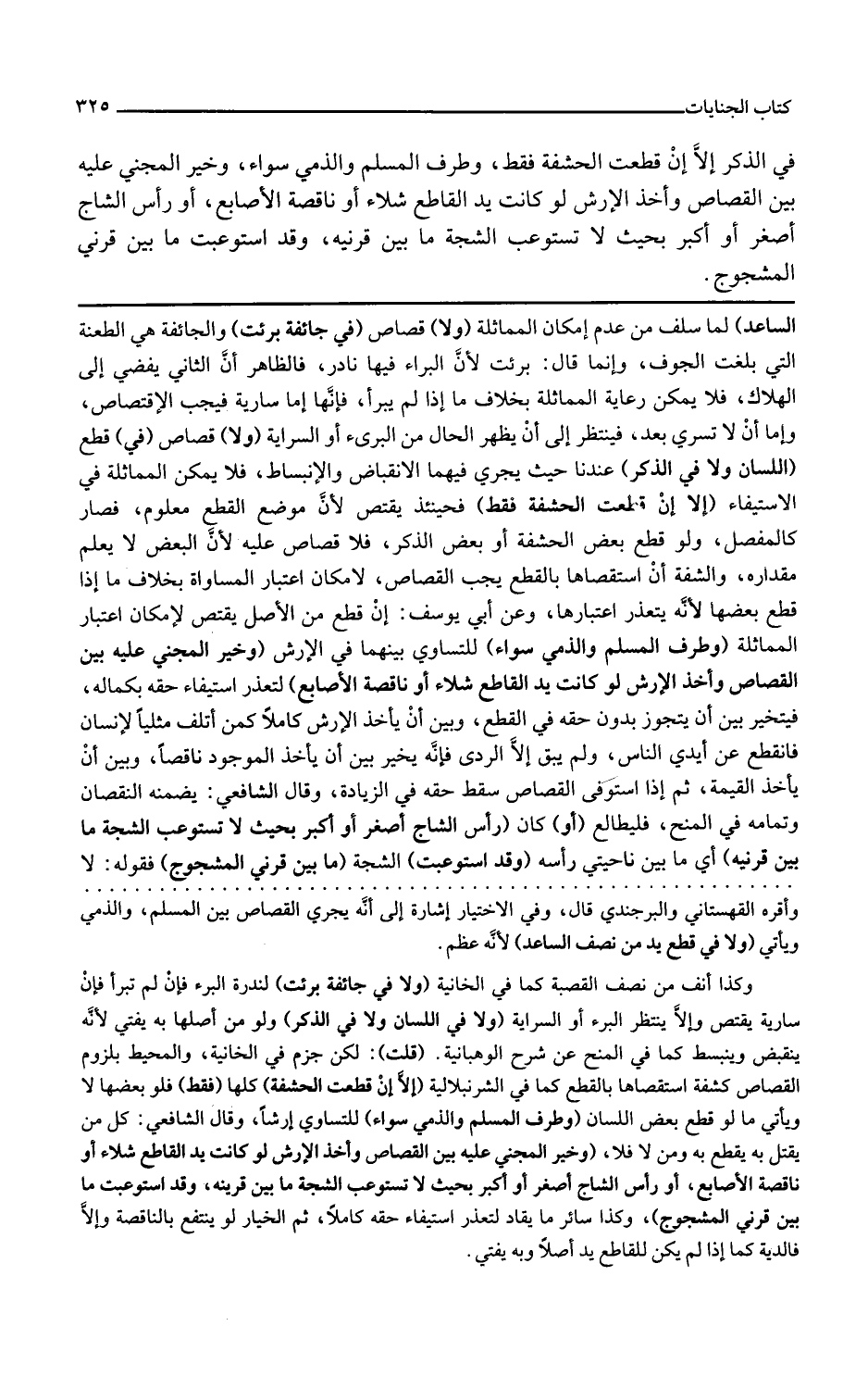 ولا قصاص في قطع اللسان ولا في الذكر عندنا حيث يجري فيهما الانقباض والانبساط فلا يمكن المماثلة في الاستيفاء إلا إن قطعت الحشفة فقط فحينئذ يقتص لأن موضع القطع معلوم فصار كالمفصل ولو قطع بعض الحشفة أو بعض الذكر فلا قصاص عليه لأن البعض لا يعلم مقداره والشفة إن استقصاها بالقطع يجب القصاص لإمكانه اعتبار المساواة بخلاف ما إذا قطع بعضهما لأنه يتعذر اعتبارها وعن أبي يوسف إن قطع من الأصل يقتص لإمكان اعتبار المماثلة
