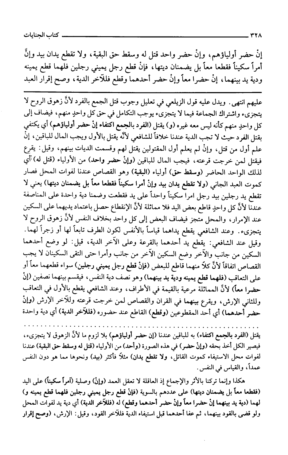 ولا تقطع يدان بيد وإن أمرا سكينا فقطعا معا بل يضمنان ديتها يعني لا تقطع يدا رجلين بيد رجل أمرا سكينا واحدا على يد فقطعت وضمنا دية واحدة على المناصفة عندنا لأن كل واحد قاطع بعض اليد فلا مماثلة لأن الانقطاع حصل باعتماد يديهما على السكين عند الإمرار والمحل متجز فيضاف البعض إلى كل واحد بخلاف النفس لأن زهوق الروح لا يتجزأ وعند الشافعي يقطع يداهما قياسا بالأنفس لكون الطرف تابعا لها أو زجرا لهما وقيل عند الشافعي يقطع يد أحدهما بالقرعة وعلى الآخر الدية قيل لو وضع أحدهما السكين من جانب والآخر وضع السكين الآخر من جانب وأمرا حتى التقى السكينان لا يجب القصاص اتفاقا لأن كلا منهما قاطع للبعض