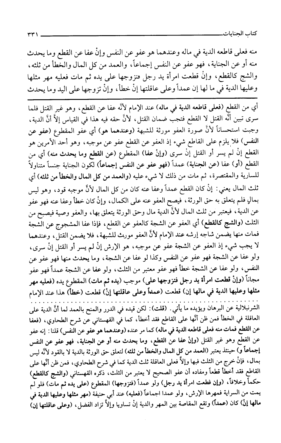 وإن عفا المقطوع عن القطع وما يحدث منه أي من القطع أو عفا عن الجناية عمدا فهو عفو عن النفس إجماعا لكون الجناية جنسا متناولا للسارية والمقتصرة ثم مات من ذلك لا شيء عليه والعمد من كل المال والخطأ من ثلثه أي ثلث المال يعني إن كان القطع عمدا وعفا عنه كان من كل المال لأن موجبه قود وهو ليس بمال فلم يتعلق به حق الورثة فيصح العفو عنه على الكمال وإن كان خطأ وعفا عنه فهو عفو عن الدية فيعتبر من ثلث المال لأن الدية مال وحق الورثة يتعلق بها والعفو وصية فيصح من الثلث والشج كالقطع أي العفو عن الشجة كالعفو عن القطع فإذا عفا المشجوج عن الشجة فمات منها يضمن شاجه أرشه عند الإمام لأن العفو مورث للشبهة فلا يضمن القتل وعندهما لا يجب شيء إذ العفو عن الشجة عفو عن موجبه هو الأرش إن لم يسر أو القتل إن سرى ولو عفا عن الشجة فهو عفو عن النفس