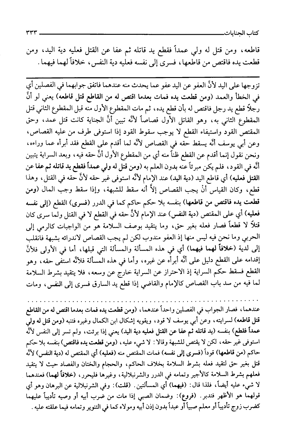 ومن قطعت يده فاقتص من قاطعها بنفسه بلا حكم حاكم كما في الدرر فسرى القطع إلى نفسه فعليه أي على المقتص دية النفس عند الإمام لأن حقه في القطع لا في القتل ولما سرى كان قتلا لا قطعا فصار فعله بغير حق وما يتقيد بوصف السلامة هو من الواجبات كالرمي إلى الحربي وما نحن فيه ليس منها إذ العفو مندوب لكن لم يجب القصاص لاندرائه بشبهة فانقلب إلى الدية خلافا لهما فيهما أي في هذه المسألة والمسألة التي قبلها أما في الأولى فلأن إقدامه على القطع دليل على أنه أبرأه عن غيره وأما في هذه المسألة فلأنه استوفى حقه وهو القطع فسقط حكم السراية إذ الاحتراز عن السراية خارج عن وسعه فلا يتقيد بشرط السلامة لما فيه من سد باب القصاص كالإمام والقاضي إذا قطع يد السارق فسرى إلى النفس ومات