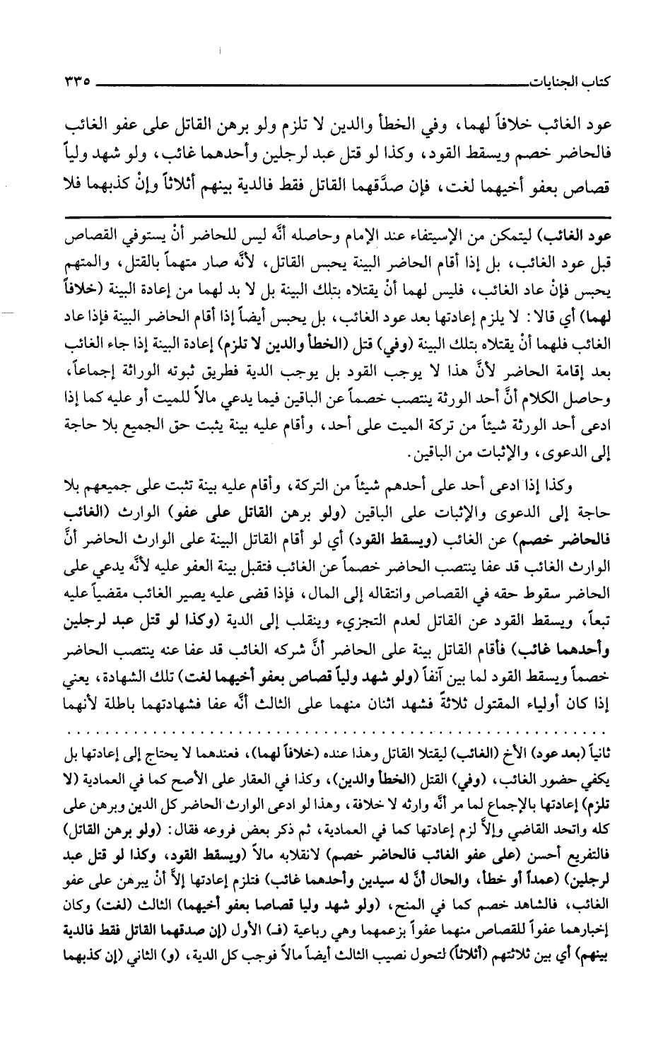 عود الغائب ليتمكن من الاستيفاء عند الإمام وحاصله أنه ليس للحاضر أن يستوفي القصاص قبل عود الغائب بل إذا أقام الحاضر البينة يحبس القاتل لأنه صار متهما بالقتل والمتهم يحبس فإن عاد الغائب فليس لهما أن يقتلاه بتلك البينة بل لا بد لهما من إعادة البينة خلافا لهما أي قالا لا يلزم إعادتها بعد عود الغائب بل يحبس أيضا إذا أقام الحاضر البينة فإذا عاد الغائب فلهما أن يقتلاه بتلك البينة وفي قتل الخطأ والدين لا تلزم إعادة البينة إذا جاء الغائب بعد إقامة الحاضر لأن هذا لا يوجب القود بل يوجب الدية فطريق ثبوته الوراثة إجماعا وحاصل الكلام أن أحد الورثة ينتصب خصما عن الباقين فيما يدعي مالا للميت أو عليه كما إذا ادعى أحد الورثة شيئا من تركة الميت على أحد وأقام عليه بينة يثبت حق الجميع بلا حاجة إلى الدعوى والإثبات من الباقين وكذا إذا ادعى أحد على أحدهم شيئا من التركة وأقام عليه بينة تثبت على جميعهم بلا حاجة إلى الدعوى والإثبات على الباقين