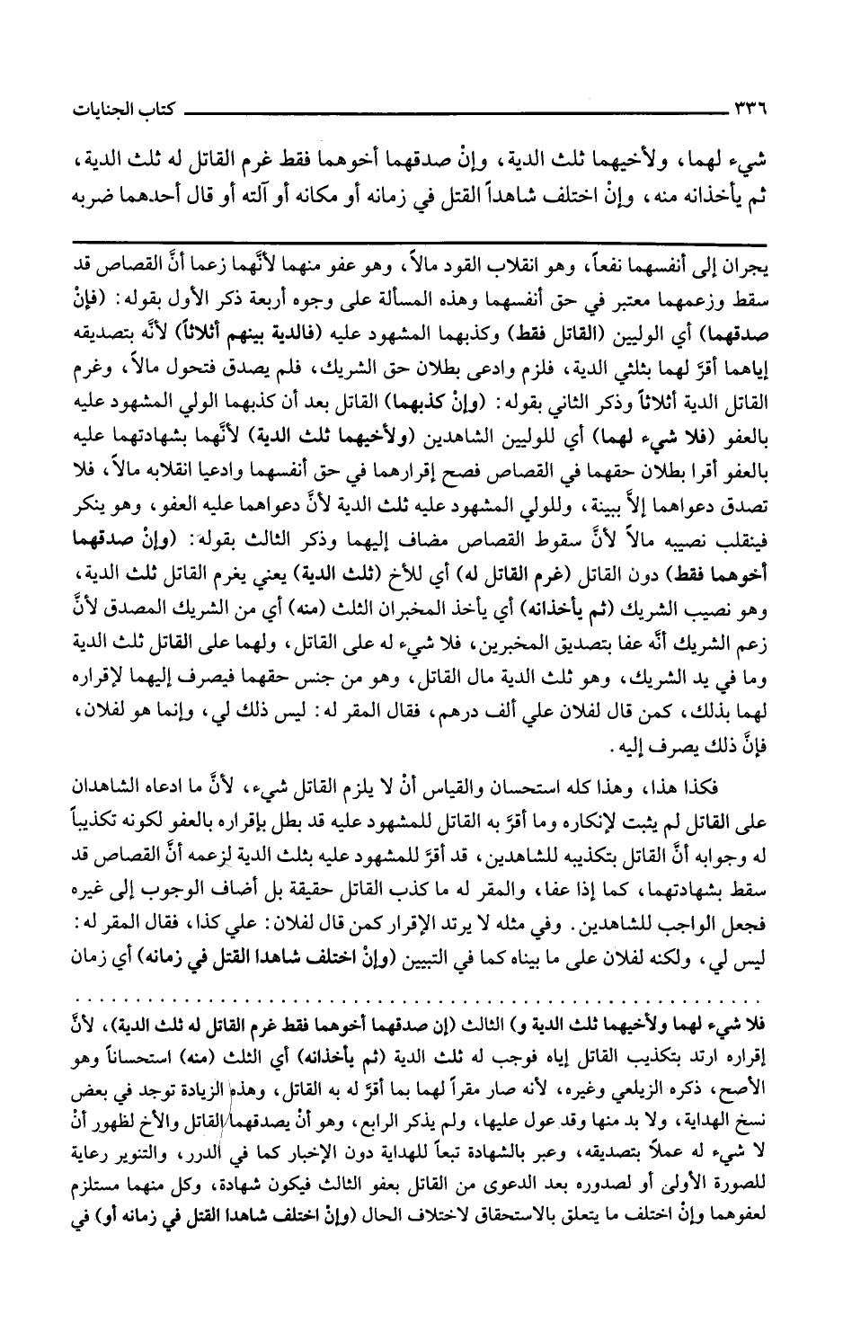 وإن كذبهما القاتل بعد أن كذبهما الولي المشهود عليه بالعفو فلا شيء لهما أي للوليين الشاهدين ولأخيهما ثلث الدية لأنهما بشهادتهما عليه بالعفو أقرا بطلان حقهما في القصاص فصح إقرارهما في حق أنفسهما وادعيا انقلابه مالا فلا تصدق دعواهما إلا ببينة وللولي المشهود عليه ثلث الدية لأن دعواهما عليه العفو وهو ينكر فينقلب نصيبه مالا لأن سقوط القصاص مضاف إليهما وذكر الثالث بقوله