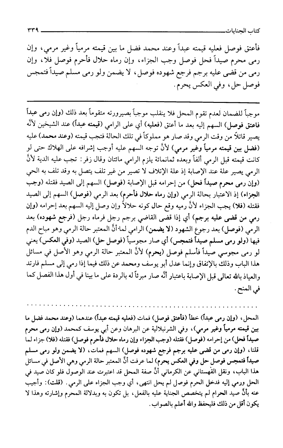 وإن رمى محرم صيدا فحل من إحرامه قبل الإصابة فوصل السهم إلى الصيد فقتله وجب الجزاء إذ الاعتبار بحالة الرمي وإن رماه حلال فأحرم بعد الرمي فوصل السهم إلى الصيد فقتله فلا يجب الجزاء لأن رميه وقع حال كونه حلالا وإن وصل إليه السهم بعد إحرامه
