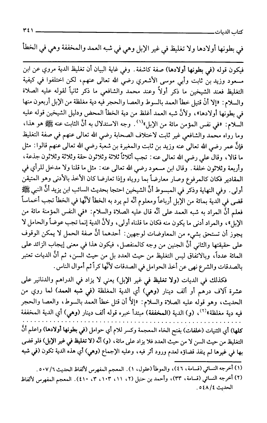 وفي النهاية وذكر في المبسوط أن الشيخين احتجا بحديث السائب بن يزيد أن النبي صلى الله تعالى عليه وسلم قضى في الدية بمائة من الإبل أرباعا ومعلوم أنه لم يرد به الخطأ لأنها في الخطأ تجب أخماسا فعلم أن المراد به شبه العمد على أنه قال عليه الصلاة والسلام في النفس المؤمنة مائة من الإبل والمراد أدنى ما يكون منه فكان ما قلناه أولى ولأن الدية إنما تجب عوضا والحامل لا يجوز أن تستحق بشيء من المعاوضات لوجهين أحدهما أن صفة الحمل لا يمكن الوقوف على حقيقتها والثاني أن الجنين من وجه كالمنفصل فيكون هذا في معنى إيجاب الزائد على المائة عددا وبالاتفاق ليس التغليظ من حيث العدد بل من حيث السن ثم إن الديات تعتبر بالصدقات والشرع نهى عن أخذ الحوامل في الصدقات لأنها كرائم أموال الناس فكذلك في الديات ولا تغليظ في غير الإبل يعني لا يزاد في الدراهم والدنانير على عشرة آلاف درهم أو ألف دينار وهي أي الدية المغلظة في شبه العمد لما روي من الحديث وهو قوله عليه الصلاة والسلام إلا أن قتيل خطأ العمد بالسوط والعصا والحجر فيه دية مغلظة
