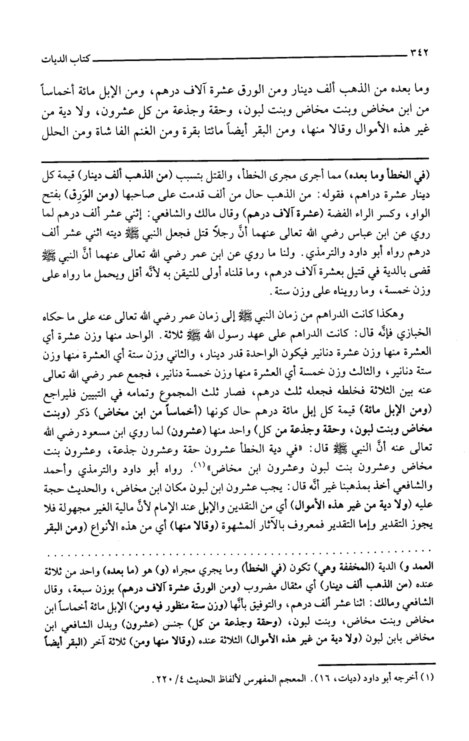 في الخطأ وما بعده مما أجري مجرى الخطأ والقتل بتسبب من الذهب ألف دينار قيمة كل دينار عشرة دراهم فقوله من الذهب حال من ألف قدمت على صاحبها ومن الورق بفتح الواو وكسر الراء الفضة عشرة آلاف درهم وقال مالك والشافعي اثنا عشر ألف درهم لما روي عن ابن عباس رضي الله تعالى عنهما أن رجلا قتل فجعل النبي صلى الله تعالى عليه وسلم ديته اثني عشر ألف درهم رواه أبو داود والترمذي ولنا ما روي عن ابن عمر رضي الله تعالى عنهما أن النبي صلى الله تعالى عليه وسلم قضى بالدية في قتيل بعشرة آلاف درهم وما قلناه أولى للتيقن به لأنه أقل ويحمل ما رواه على وزن خمسة وما رويناه على وزن ستة وهكذا كانت الدراهم من زمان النبي صلى الله تعالى عليه وسلم إلى زمان عمر رضي الله تعالى عنه على ما حكاه الخبازي فإنه قال كانت الدراهم على عهد رسول الله صلى الله تعالى عليه وسلم ثلاثة الواحد منها وزن عشرة أي العشرة منها وزن عشرة دنانير فيكون الواحدة قدر دينار والثاني وزن ستة أي العشرة منها وزن ستة دنانير والثالث وزن خمسة أي العشرة منها وزن خمسة دنانير فجمع عمر رضي الله تعالى عنه بين الثلاثة فخلطه فجعله ثلث درهم فصار ثلث المجموع وتمامه في التبيين فليراجع ومن الإبل مائة قيمة كل إبل مائة درهم حال كونها أخماسا من ابن مخاض ذكر وبنت مخاض وبنت لبون وحقة وجذعة من كل واحد منها عشرون لما روى ابن مسعود رضي الله تعالى عنه أن النبي صلى الله تعالى عليه وسلم قال في دية الخطأ عشرون حقة وعشرون جذعة وعشرون بنت مخاض وعشرون بنت لبون وعشرون ابن مخاض رواه أبو داود والترمذي وأحمد والشافعي أخذا بمذهبنا غير أنه قال يجب عشرون ابن لبون مكان ابن مخاض والحديث حجة عليه ولا دية من غير هذه الأموال أي من النقدين والإبل عند الإمام لأن مالية الغير مجهولة فلا يجوز التقدير وأما التقدير فمعروف بالآثار المشهورة وقالا منها أي من هذه الأنواع ومن البقر أيضا مائتا بقرة قيمة كل بقرة خمسون ومن الغنم ألفا شاة كل شاة خمس ومن الحلل مائتا