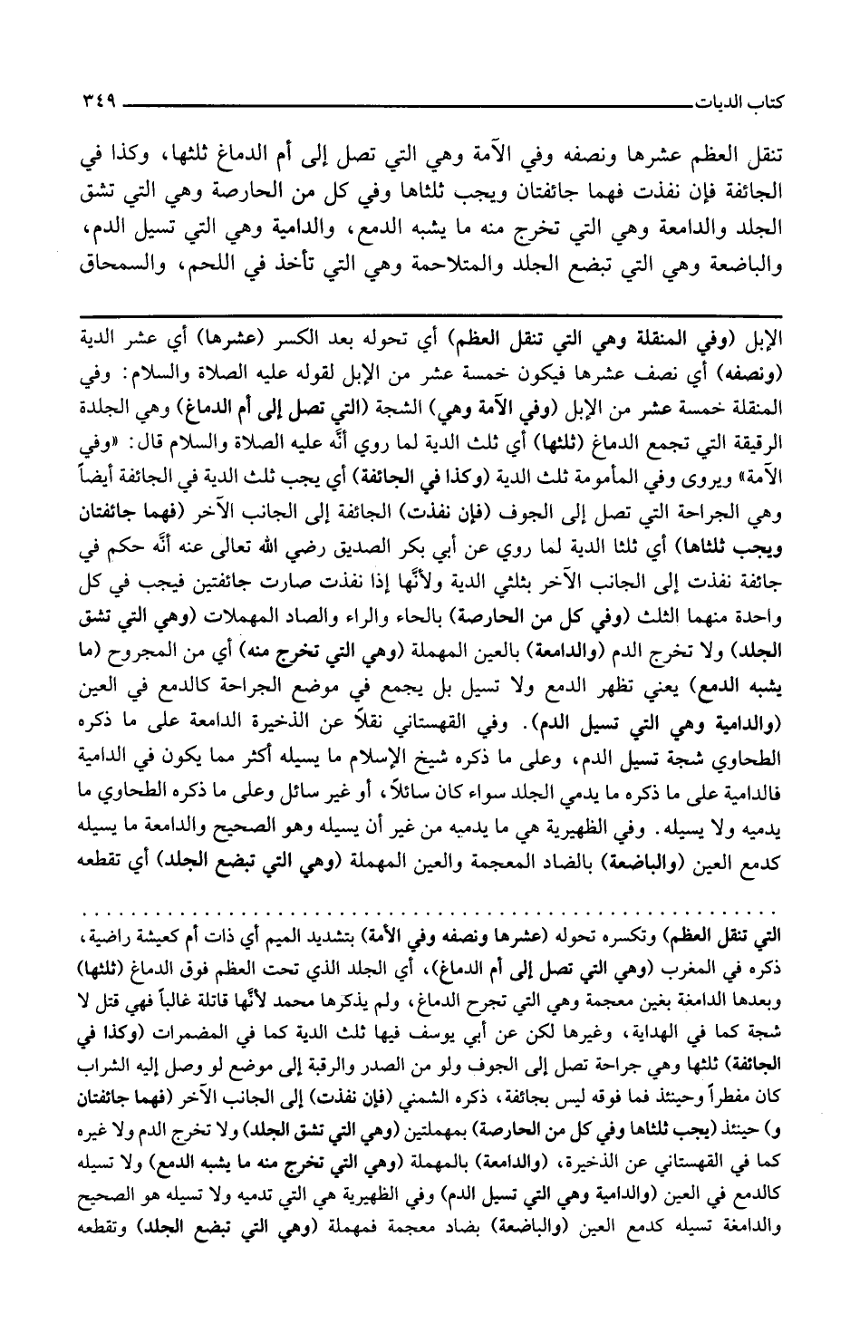 وفي كل من الحارصة بالحاء والراء والصاد المهملات وهي التي تشق الجلد ولا تخرج الدم والدامعة بالعين المهملة وهي التي تخرج منه أي من المجروح ما يشبه الدمع يعني تظهر الدمع ولا تسيل بل يجمع في موضع الجراحة كالدمع في العين والدامية وهي التي تسيل الدم
