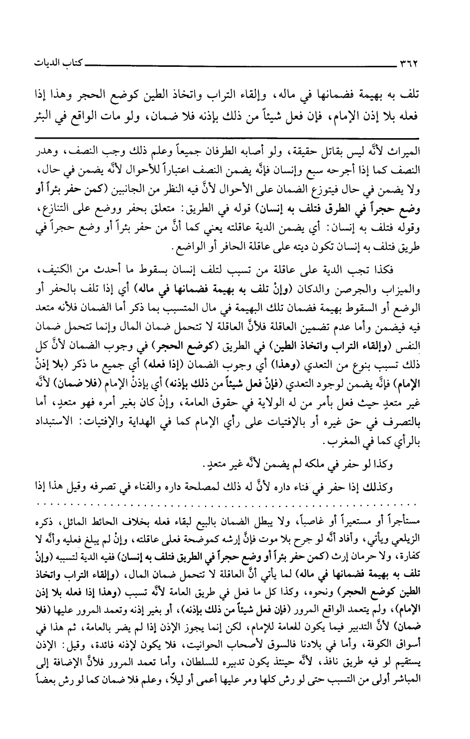 وإلقاء التراب واتخاذ الطين في الطريق كوضع الحجر في وجوب الضمان لأن كل ذلك تسبب بنوع من التعدي وهذا أي وجوب الضمان إذا فعله أي جميع ما ذكر بلا إذن الإمام فإنه يضمن لوجود التعدي فإن فعل شيئا من ذلك بإذنه أي بإذن الإمام فلا ضمان لأنه غير متعد حيث فعل بأمر من له الولاية في حقوق العامة وإن كان بغير أمره فهو متعد إما بالتصرف في حق غيره أو بالافتيات على رأي الإمام كما في الهداية والافتيات الاستبداد بالرأي كما في المغرب وكذا لو حفر في ملكه لم يضمن لأنه غير متعد وكذلك إذا حفر في فناء داره لأن له ذلك لمصلحة داره والفناء في تصرفه وقيل هذا إذا