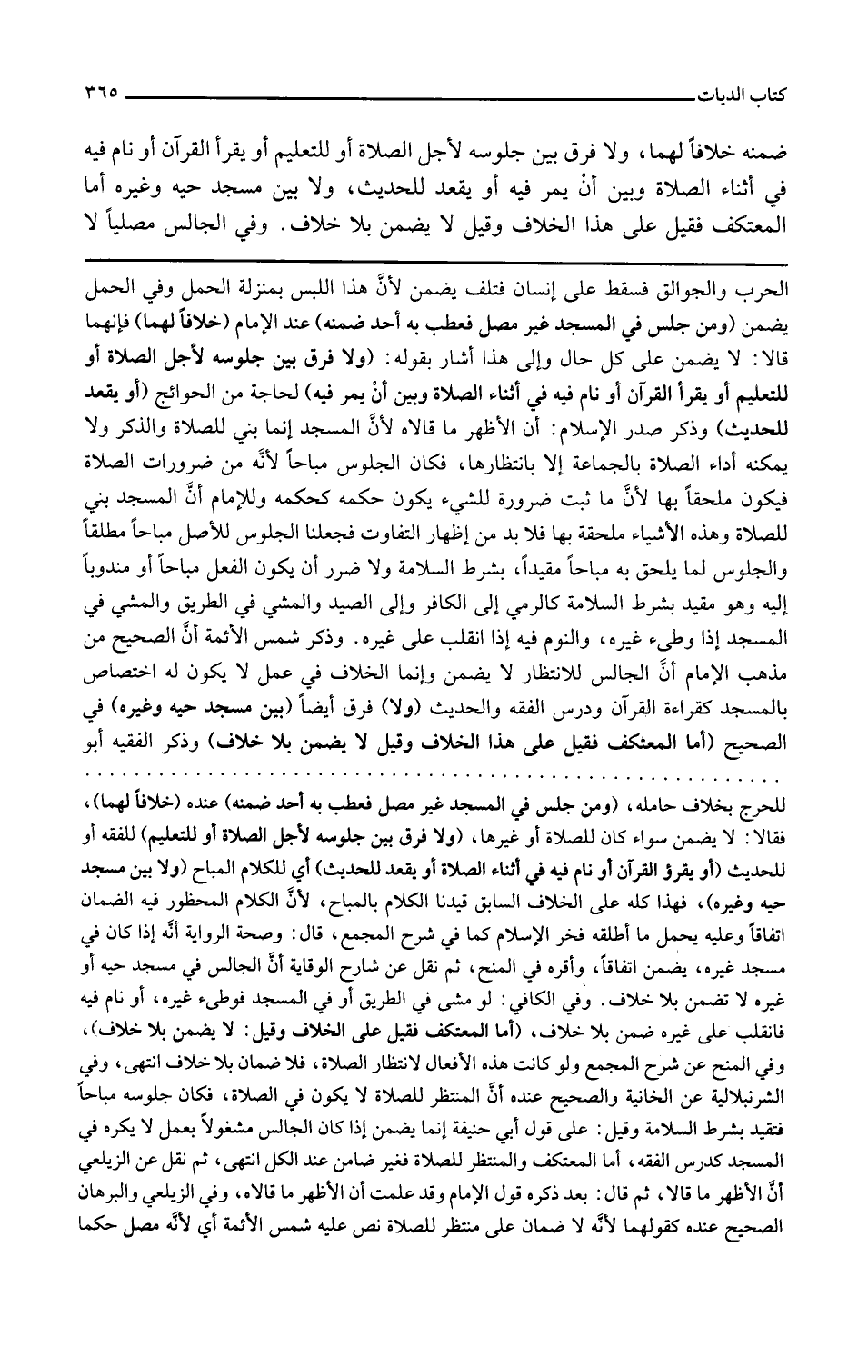 ومن جلس في المسجد غير مصل فعطب به أحد ضمنه عند الإمام خلافا لهما فإنهما قالا لا يضمن على كل حال وإلى هذا أشار بقوله ولا فرق بين جلوسه لأجل الصلاة أو للتعليم أو يقرأ القرآن أو نام فيه في أثناء الصلاة وبين أن يمر فيه لحاجة من الحوائج أو يقعد للحديث وذكر صدر الإسلام أن الأظهر ما قالاه لأن المسجد إنما بني للصلاة والذكر ولا يمكنه أداء الصلاة بالجماعة إلا بانتظارها فكان الجلوس مباحا لأنه من ضرورات الصلاة فيكون ملحقا بها لأن ما ثبت ضرورة للشيء يكون حكمه كحكمه وللإمام أن المسجد بني للصلاة وهذه الأشياء ملحقة بها فلا بد من إظهار التفاوت فجعلنا الجلوس للأصل مباحا مطلقا والجلوس لما يلحق به مباحا مقيدا بشرط السلامة ولا ضرر أن يكون الفعل مباحا أو مندوبا إليه وهو مقيد بشرط السلامة كالرمي إلى الكافر وإلى الصيد والمشي في الطريق والمشي في المسجد إذا وطئ غيره والنوم فيه إذا انقلب على غيره وذكر شمس الأئمة أن الصحيح من مذهب الإمام أن الجالس للانتظار لا يضمن وإنما الخلاف في عمل لا يكون له اختصاص بالمسجد كقراءة القرآن ودرس الفقه والحديث ولا فرق أيضا بين مسجد حيه وغيره في الصحيح أما المعتكف فقيل على هذا الخلاف وقيل لا يضمن بلا خلاف وذكر الفقيه أبو