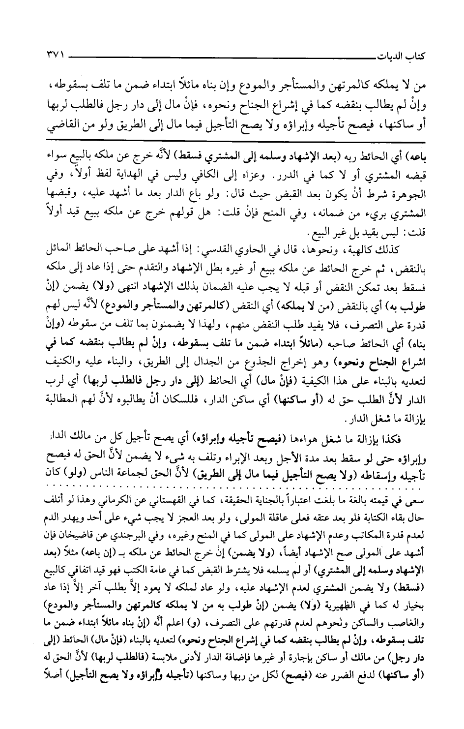 وفي المنح فإن قلت هل قولهم خرج عن ملكه ببيع قيد أو لا قلت ليس بقيد بل غير البيع كذلك كالهبة ونحوها قال في الحاوي القدسي إذا أشهد على صاحب الحائط المائل بالنقض ثم خرج الحائط عن ملكه ببيع أو غيره بطل الإشهاد والتقدم حتى إذا عاد إلى ملكه فسقط بعد تمكن النقض أو قبله لا يجب عليه الضمان بذلك الإشهاد انتهى ولا يضمن إن طولب به أي بالنقض من لا يملكه أي النقض كالمرتهن والمستأجر والمودع لأنه ليس لهم قدرة على التصرف فلا يفيد طلب النقض منهم ولهذا لا يضمنون بما تلف من سقوطه