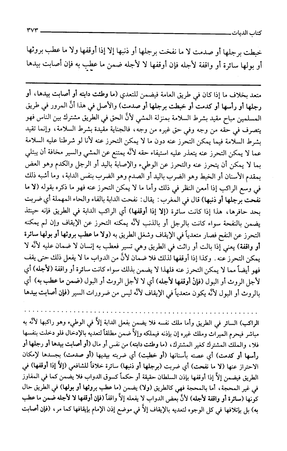 متعد بخلاف ما إذا كان في طريق العامة فيضمن للتعدي ما وطئت دابته أو أصابت بيدها أو رجلها أو رأسها أو كدمت أو خبطت برجلها أو صدمت والأصل في هذا أن المرور في طريق المسلمين مباح مقيد بشرط السلامة بمنزلة المشي لأن الحق في الطريق مشترك بين الناس فهو يتصرف في حقه من وجه وفي حق غيره من وجه فالجناية مقيدة بشرط السلامة وإنما تقيد بشرط السلامة فيما يمكن التحرز عنه دون ما لا يمكن التحرز عنه لأنا لو شرطنا عليه السلامة عما لا يمكن التحرز عنه يتعذر عليه استيفاء حقه لأنه يمتنع عن المشي والسير مخافة أن يبتلى بما لا يمكن أن يتحرز عنه والتحرز عن الوطء والإصابة باليد أو الرجل والكدم وهو العض بمقدم الأسنان أو الخبط وهو الضرب باليد أو الصدم وهو الضرب بنفس الدابة وما أشبه ذلك في وسع الراكب إذا أمعن النظر في ذلك وأما ما لا يمكن التحرز عنه فهو ما ذكره بقوله لا ما نفحت برجلها أو ذنبها قال في المغرب يقال نفحت الدابة بالفاء والحاء المهملة أي ضربت بحد حافرها هذا إذا كانت سائرة إلا إذا أوقفها أي الراكب الدابة في الطريق فإنه حينئذ يضمن بالنفحة سواء كانت بالرجل أو بالذنب لأنه يمكنه التحرز عن الإيقاف وإن لم يمكنه التحرز عن النفح فصار متعديا في الإيقاف وشغل الطريق به ولا ما عطب بروثها أو بولها سائرة أو واقفة يعني إذا بالت أو راثت في الطريق وهي تسير فعطب به إنسان لا ضمان عليه لأنه لا يمكن التحرز عنه وكذا إذا أوقفها لذلك فلا ضمان لأن من الدواب ما لا يفعل ذلك حتى يقف فهو أيضا مما لا يمكن التحرز عنه فلهذا لا يضمن بذلك سواء كانت سائرة أو واقفة لأجله أي لأجل الروث أو البول فإن أوقفها لا لأجله أي لا لأجل الروث أو البول ضمن ما عطب به أي بالروث أو البول لأنه يكون متعديا في الإيقاف لأنه ليس من ضرورات السير