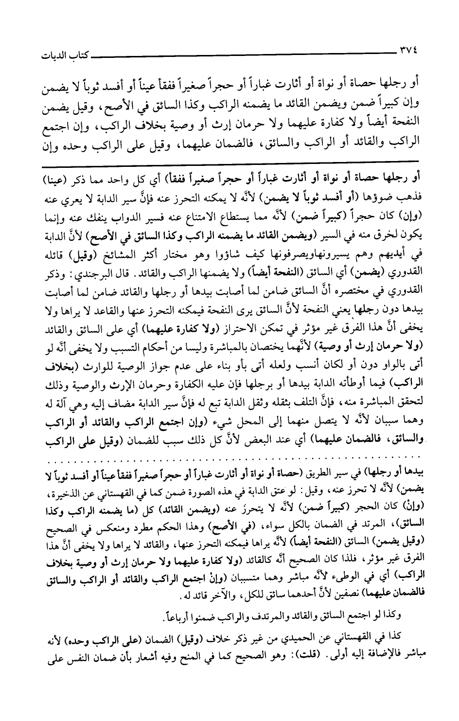 أو رجلها حصاة أو نواة أو أثارت غبارا أو حجرا صغيرا ففقأ أي كل واحد مما ذكر عينا فذهب ضوءها أو أفسد ثوبا لا يضمن لأنه لا يمكنه التحرز عنه فإن سير الدابة لا يعري عنه وإن كان حجرا كبيرا ضمن لأنه مما يستطاع الامتناع عنه فسير الدواب ينفك عنه وإنما يكون لخرق منه في السير ويضمن القائد ما يضمنه الراكب وكذا السائق في الأصح لأن الدابة في أيديهم وهم يسيرونها ويصرفونها كيف شاءوا وهو مختار أكثر المشايخ وقيل قائله القدوري يضمن أي السائق النفحة أيضا ولا يضمنها الراكب والقائد قال البرجندي وذكر القدوري في مختصره أن السائق ضامن لما أصابت بيدها أو رجلها والقائد ضامن لما أصابت بيدها دون رجلها يعني النفحة لأن السائق يرى النفحة فيمكنه التحرز عنها والقاعد لا يراها ولا يخفى أن هذا الفرق غير مؤثر في تمكن الاحتراز ولا كفارة عليهما أي على السائق والقائد ولا حرمان إرث أو وصية لأنهما يختصان بالمباشرة وليسا من أحكام التسبيب ولا يخفى أنه لو أتى بالواو دون أو لكان أنسب ولعله أتى بأو بناء على عدم جواز الوصية للوارث بخلاف الراكب فيما أوطأته الدابة بيدها أو برجلها فإن عليه الكفارة وحرمان الإرث والوصية وذلك لتحقق المباشرة منه فإن التلف بثقله وثقل الدابة تبع له فإن سير الدابة مضاف إليه وهي آلة له وهما سببان لأنه لا يتصل منهما إلى المحل شيء