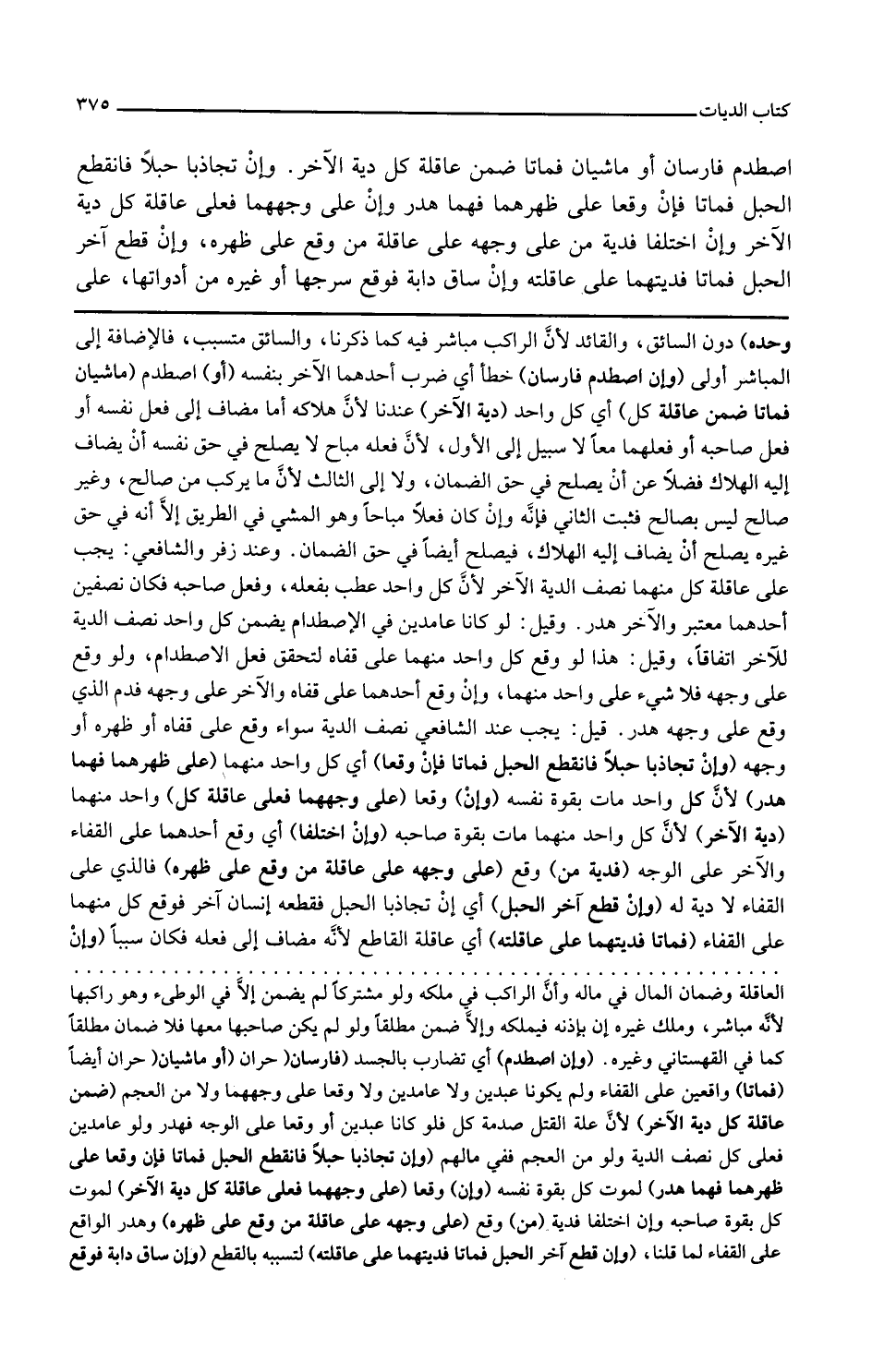 وإن اصطدم فارسان خطأ أي ضرب أحدهما الآخر بنفسه أو اصطدم ماشيان فماتا ضمن عاقلة كل أي كل واحد دية الآخر عندنا لأن هلاكه إما مضاف إلى فعل نفسه أو فعل صاحبه أو فعلهما معا لا سبيل إلى الأول لأن فعله مباح لا يصلح في حق نفسه أن يضاف إليه الهلاك فضلا عن أن يصلح في حق الضمان ولا إلى الثالث لأن ما يركب من صالح وغير صالح ليس بصالح فثبت الثاني فإنه وإن كان فعلا مباحا وهو المشي في الطريق إلا أنه في حق غيره يصلح أن يضاف إليه الهلاك فيصلح أيضا في حق الضمان وعند زفر والشافعي يجب على عاقلة كل منهما نصف دية الآخر لأن كل واحد عطب بفعله وفعل صاحبه فكان نصفين أحدهما معتبر والآخر هدر قيل لو كانا عامدين في الاصطدام يضمن كل واحد نصف الدية للآخر اتفاقا وقيل هذا لو وقع كل واحد منهما على قفاه لتحقق فعل الاصطدام ولو وقع على وجهه فلا شيء على واحد منهما وإن وقع أحدهما على قفاه والآخر على وجهه فدم الذي وقع على وجهه هدر قيل يجب عند الشافعي نصف الدية سواء وقع على قفاه أو ظهره أو وجهه