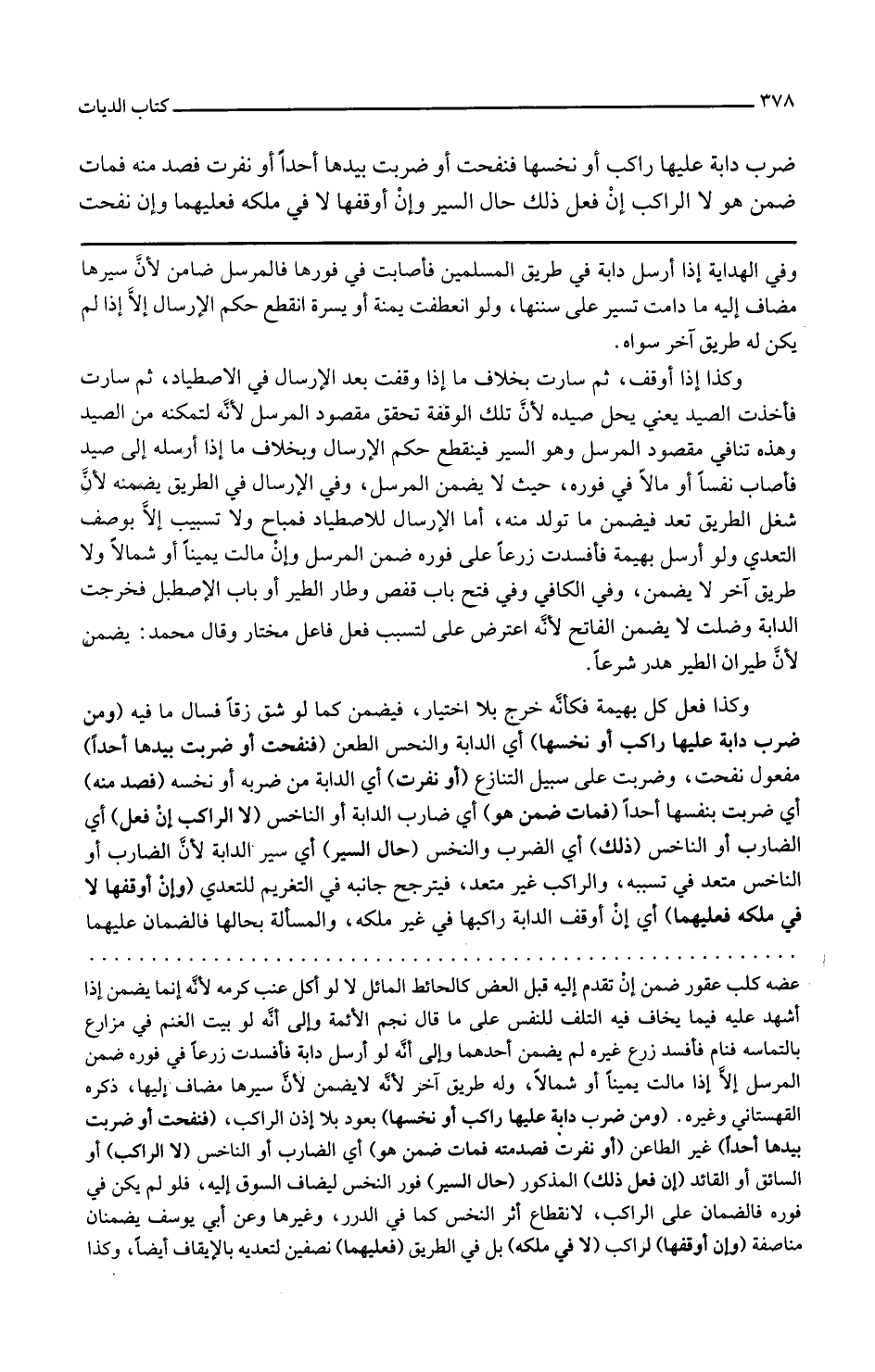 وفي الهداية إذا أرسل دابة في طريق المسلمين فأصابت في فورها فالمرسل ضامن لأن سيرها مضاف إليه ما دامت تسير على سننها ولو انعطفت يمنة أو يسرة انقطع حكم الإرسال إلا إذا لم يكن له طريق آخر سواه وكذا إذا أوقف ثم سارت بخلاف ما إذا وقفت بعد الإرسال في الاصطياد ثم سارت فأخذت الصيد يعني يحل صيده لأن تلك الوقفة تحقق مقصود المرسل لأنه لتمكنه من الصيد وهذه تنافي مقصود المرسل وهو السير فينقطع حكم الإرسال وبخلاف ما إذا أرسله إلى صيد فأصاب نفسا أو مالا في فوره حيث لا يضمن المرسل وفي الإرسال في الطريق يضمنه لأن شغل الطريق تعد فيضمن ما تولد منه أما الإرسال للاصطياد فمباح ولا تسبيب إلا بوصف التعدي ولو أرسل بهيمة فأفسدت زرعا على فوره ضمن المرسل وإن مالت يمينا أو شمالا وله طريق آخر لا يضمن