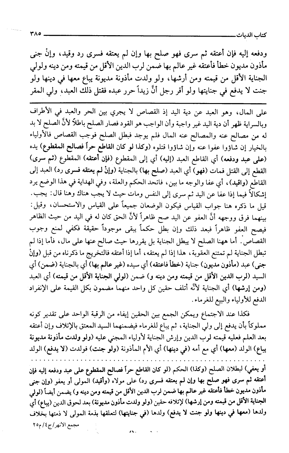وإن جنى عبد مأذون مديون جناية خطأ فأعتقه أي سيده غير عالم بها أي بالجناية ضمن أي السيد لرب الدين الأقل من قيمته ومن دينه و ضمن لولي الجناية الأقل من قيمته أي العبد ومن أرشها أي الجناية لأنه أتلف حقين كل واحد منهما مضمون بكل القيمة على الانفراد الدفع للأولياء والبيع للغرماء فكذا عند الاجتماع ويمكن الجمع بين الحقين إيفاء من الرقبة الواحد على تقدير كونه مملوكا بأن يدفع إلى ولي الجناية ثم يباع للغرماء فيضمنهما السيد المعتق بالإتلاف وإن أعتقه بعد العلم فعليه قيمته لرب الدين وأرش الجناية لأولياء المجني عليه