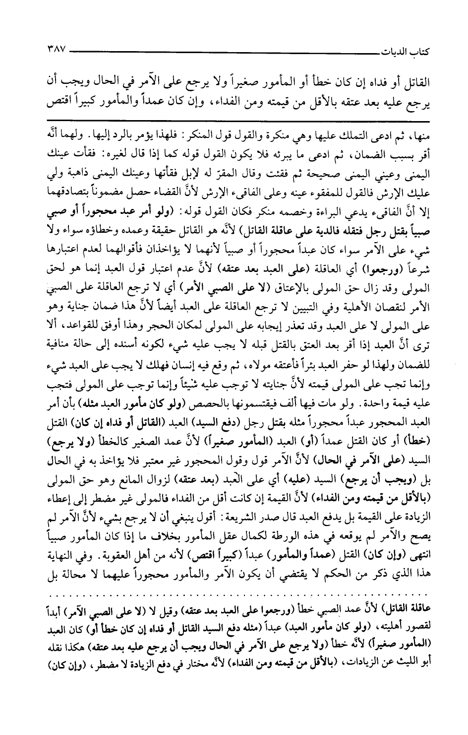 وفي التبيين لا ترجع العاقلة على العبد أيضا لأن هذا ضمان جناية وهو على المولى لا على العبد وقد تعذر إيجابه على المولى لمكان الحجر وهذا أوفق للقواعد ألا ترى أن العبد إذا أقر بعد العتق بالقتل قبله لا يجب عليه شيء لكونه أسنده إلى حالة منافية للضمان ولهذا لو حفر العبد بئرا فأعتقه مولاه ثم وقع فيه إنسان فهلك لا يجب على العبد شيء وإنما تجب على المولى قيمته لأن جنايته لا توجب عليه شيئا وإنما توجب على المولى فتجب عليه قيمة واحدة ولو مات فيها ألف فيقتسمونها بالحصص
