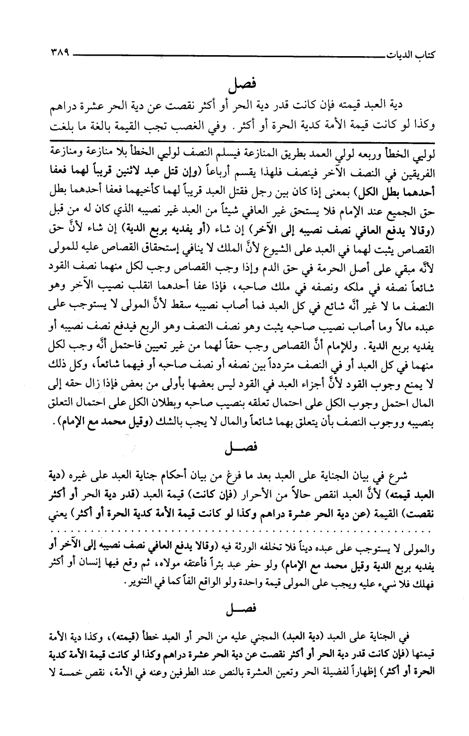 شرع في بيان الجناية على العبد بعدما فرغ من بيان أحكام جناية العبد على غيره دية العبد قيمته لأن العبد أنقص حالا من الأحرار فإن كانت قيمة العبد قدر دية الحر أو أكثر نقصت القيمة عن دية الحر عشرة دراهم وكذا لو كانت قيمة الأمة كدية الحرة أو أكثر يعني