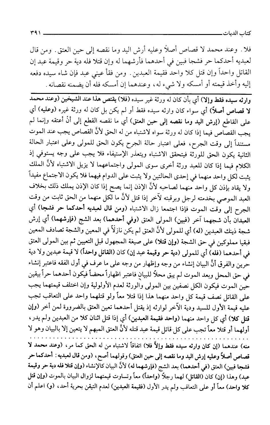 وارثه سيده فقط وإلا أي بأن كان له ورثة غير سيده فلا يقتص هذا عند الشيخين وعند محمد لا قصاص أصلا أي سواء كان وارثه سيده فقط أو لم يكن بل كان له ورثة غيره وعليه أي على القاطع أرش اليد وما نقصه إلى حين العتق أي ما نقصه القطع إلى أن أعتقه وإنما لم يجب القصاص فيما إذا كان له ورثة سواه لاشتباه من له الحق لأن القصاص يجب عند الموت مستندا إلى وقت الجرح فعلى اعتبار حالة الجرح يكون الحق للمولى وعلى اعتبار الحالة الثانية يكون الحق للورثة فيتحقق الاشتباه ويتعذر الاستيفاء فلا يجب على وجه يستوفى إذ الكلام فيما إذا كان للعبد ورثة أخرى سوى المولى واجتماعها لا يزيل الاشتباه لأن الملك يثبت لكل واحد منهما في إحدى الحالتين ولا يثبت على الدوام فيهما فلا يكون الاجتماع مفيدا ولا يقاد بإذن كل واحد منهما لصاحبه لأن الإذن إنما يصح إذا كان الآذن يملك ذلك بخلاف العبد الموصي بخدمته لرجل وبرقبته لآخر إذا قتل لأن ما لكل منهما من الحق ثابت من وقت الجرح إلى وقت الموت فإذا اجتمعا زال الاشتباه