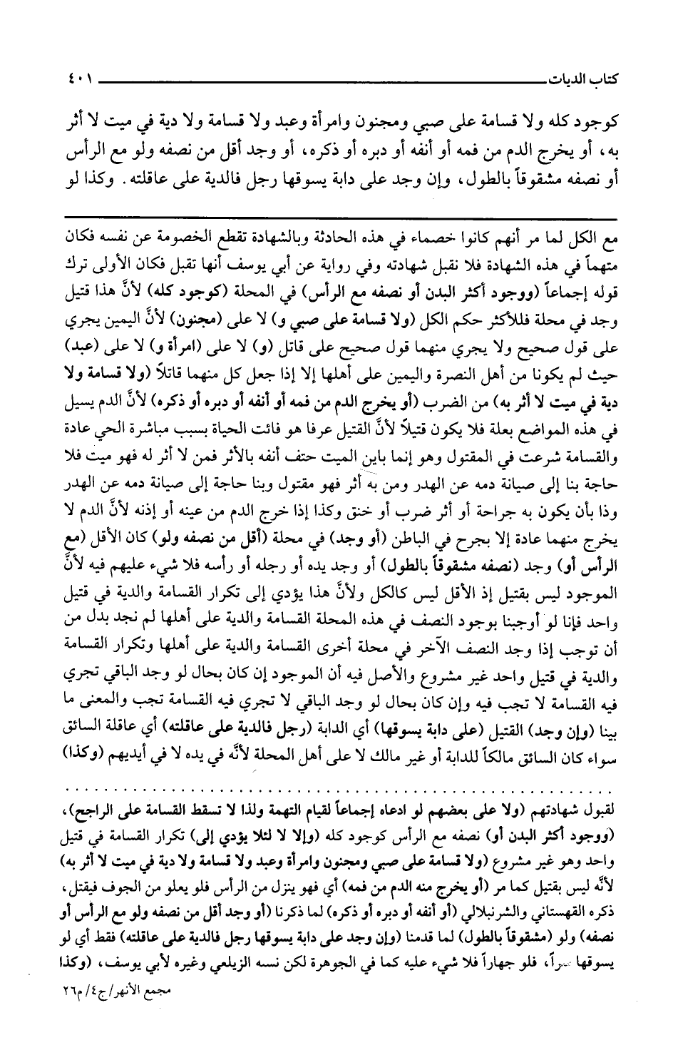 ولا قسامة ولا دية في ميت لا أثر به من الضرب أو يخرج الدم من فمه أو أنفه أو دبره أو ذكره لأن الدم يسيل في هذه المواضع بعلة فلا يكون قتيلا لأن القتيل عرفا هو فائت الحياة بسبب مباشرة الحي عادة والقسامة شرعت في المقتول وهو إنما باين الميت حتف أنفه بالأثر فمن لا أثر له فهو ميت فلا حاجة بنا إلى صيانة دمه عن الهدر ومن به أثر فهو مقتول وبنا حاجة إلى صيانة دمه عن الهدر وذا بأن يكون به جراحة أو أثر ضرب أو خنق وكذا إذا خرج الدم من عينه أو أذنه لأن الدم لا يخرج منهما عادة إلا بجرح في الباطن أو وجد في محلة أقل من نصفه ولو كان الأقل مع الرأس أو وجد نصفه مشقوقا بالطول أو وجد يده أو رجله أو رأسه فلا شيء عليهم فيه لأن الموجود ليس بقتيل إذ الأقل ليس كالكل ولأن هذا يؤدي إلى تكرار القسامة والدية في قتيل واحد فإنا لو أوجبنا بوجود النصف في هذه المحلة القسامة والدية على أهلها لم نجد بدا من أن نوجب إذا وجد النصف الآخر في محلة أخرى القسامة والدية على أهلها وتكرار القسامة والدية في قتل واحد غير مشروع والأصل فيه أن الموجود إن كان بحال لو وجد الباقي تجري فيه القسامة لا تجب فيه وإن كان بحال لو وجد الباقي لا تجري فيه القسامة تجب والمعنى ما بينا
