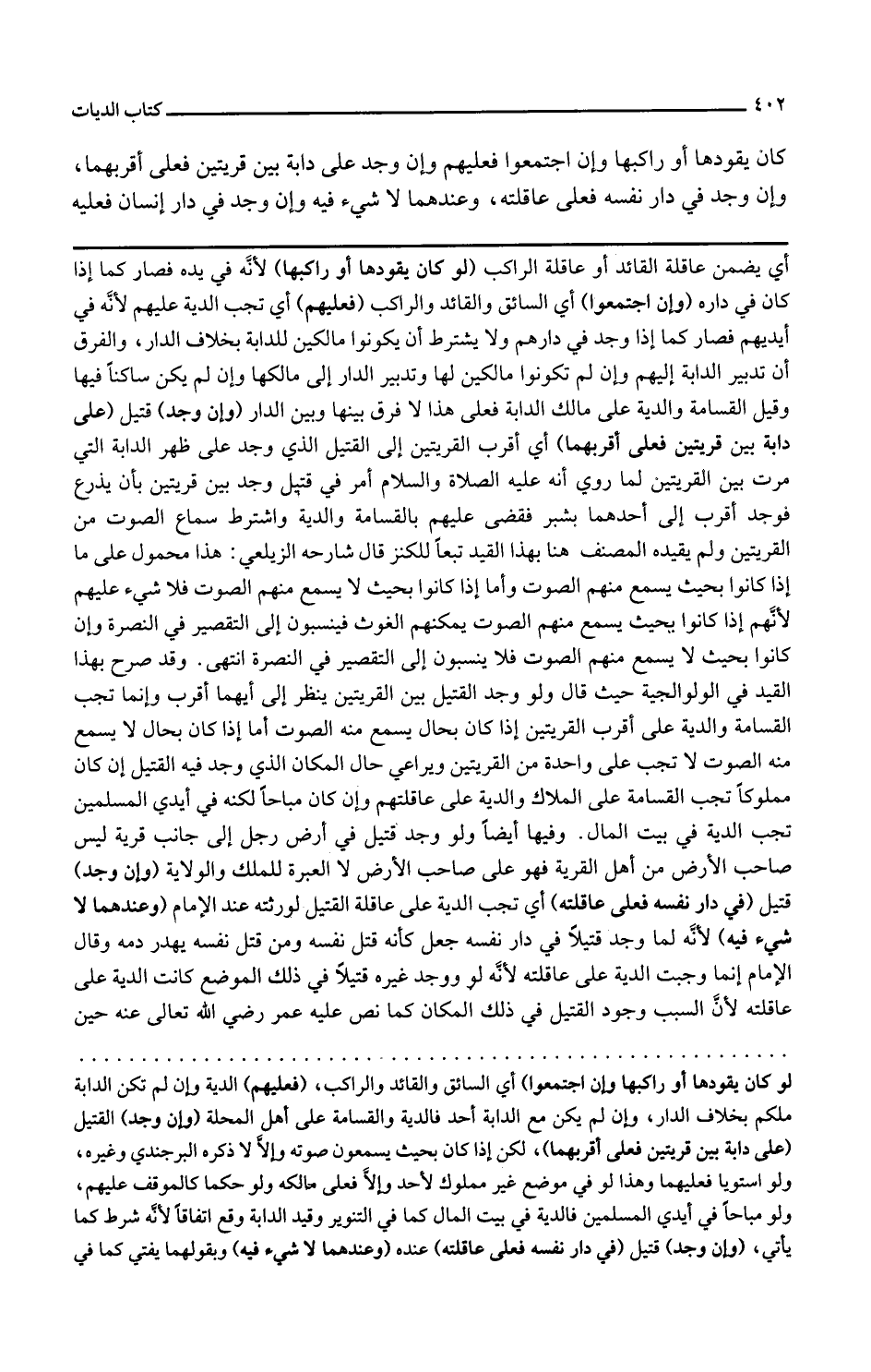 وإن وجد قتيل على دابة بين قريتين فعلى أقربهما أي أقرب القريتين إلى القتيل الذي وجد على ظهر الدابة التي مرت بين القريتين لما روي أنه عليه الصلاة والسلام أمر في قتيل وجد بين قريتين بأن يذرع فوجد أقرب إلى أحدهما بشبر فقضى عليهم بالقسامة والدية واشترط سماع الصوت من القريتين ولم يقيده المصنف هنا بهذا القيد تبعا للكنز قال شارحه الزيلعي هذا محمول على ما إذا كانوا بحيث يسمع منهم الصوت وأما إذا كانوا بحيث لا يسمع منهم الصوت فلا شيء عليهم لأنهم إذا كانوا بحيث يسمع منهم الصوت يمكنهم الغوث فينسبون إلى التقصير في النصرة وإن كانوا بحيث لا يسمع منهم الصوت فلا ينسبون إلى التقصير في النصرة انتهى