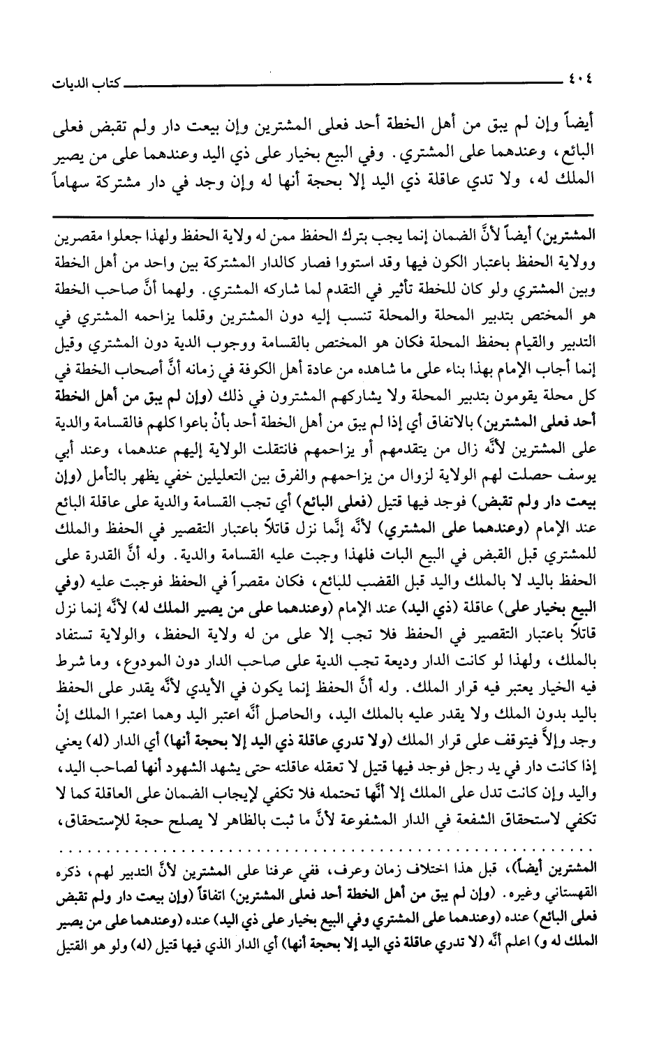 المشترين أيضا لأن الضمان إنما يجب بترك الحفظ ممن له ولاية الحفظ ولهذا جعلوا مقصرين وولاية الحفظ باعتبار الكون فيها وقد استووا فصار كالدار المشتركة بين واحد من أهل الخطة وبين المشتري ولو كان للخطة تأثير في التقدم لما شاركه المشتري ولهما أن صاحب الخطة هو المختص بتدبير المحلة والمحلة تنسب إليه دون المشترين وقلما يزاحمه المشتري في التدبير والقيام بحفظ المحلة فكان هو المختص بالقسامة ووجوب الدية دون المشتري وقيل إنما أجاب الإمام بهذا بناء على ما شاهده من عادة أهل الكوفة في زمانه أن أصحاب الخطة في كل محلة يقومون بتدبير المحلة ولا يشاركهم المشترون في ذلك