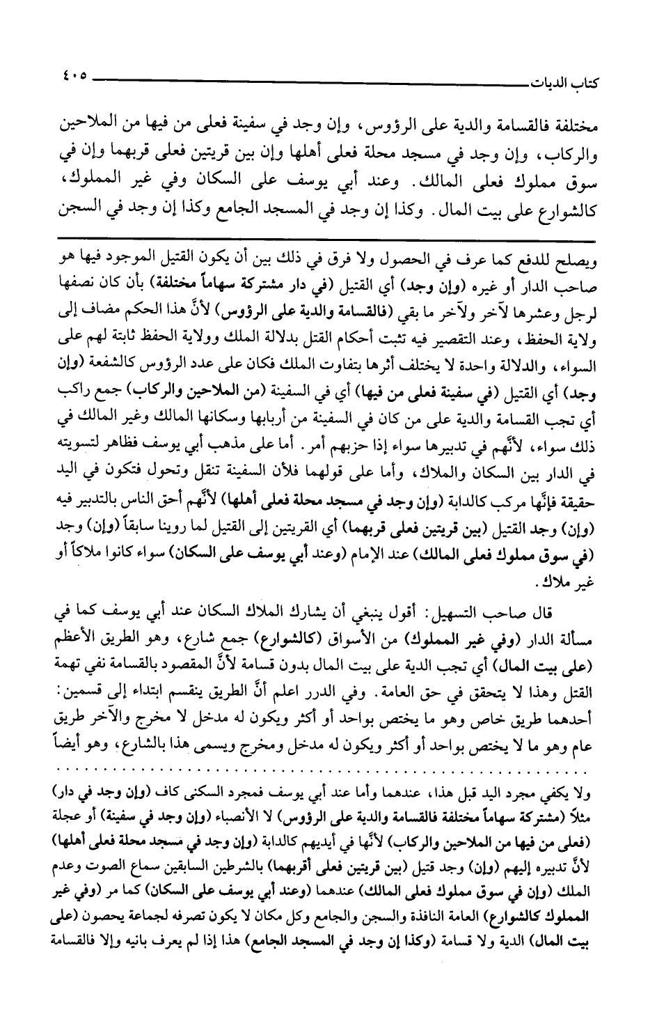 وإن وجد في سوق مملوك فعلى المالك عند الإمام وعند أبي يوسف على السكان سواء كانوا ملاكا أو غير ملاك قال صاحب التسهيل أقول ينبغي أن يشارك الملاك السكان عند أبي يوسف كما في مسألة الدار وفي غير المملوك من الأسواق كالشوارع جمع شارع وهو الطريق الأعظم على بيت المال أي تجب الدية على بيت المال بدون قسامة لأن المقصود بالقسامة نفي تهمة القتل وهذا لا يتحقق في حق العامة
