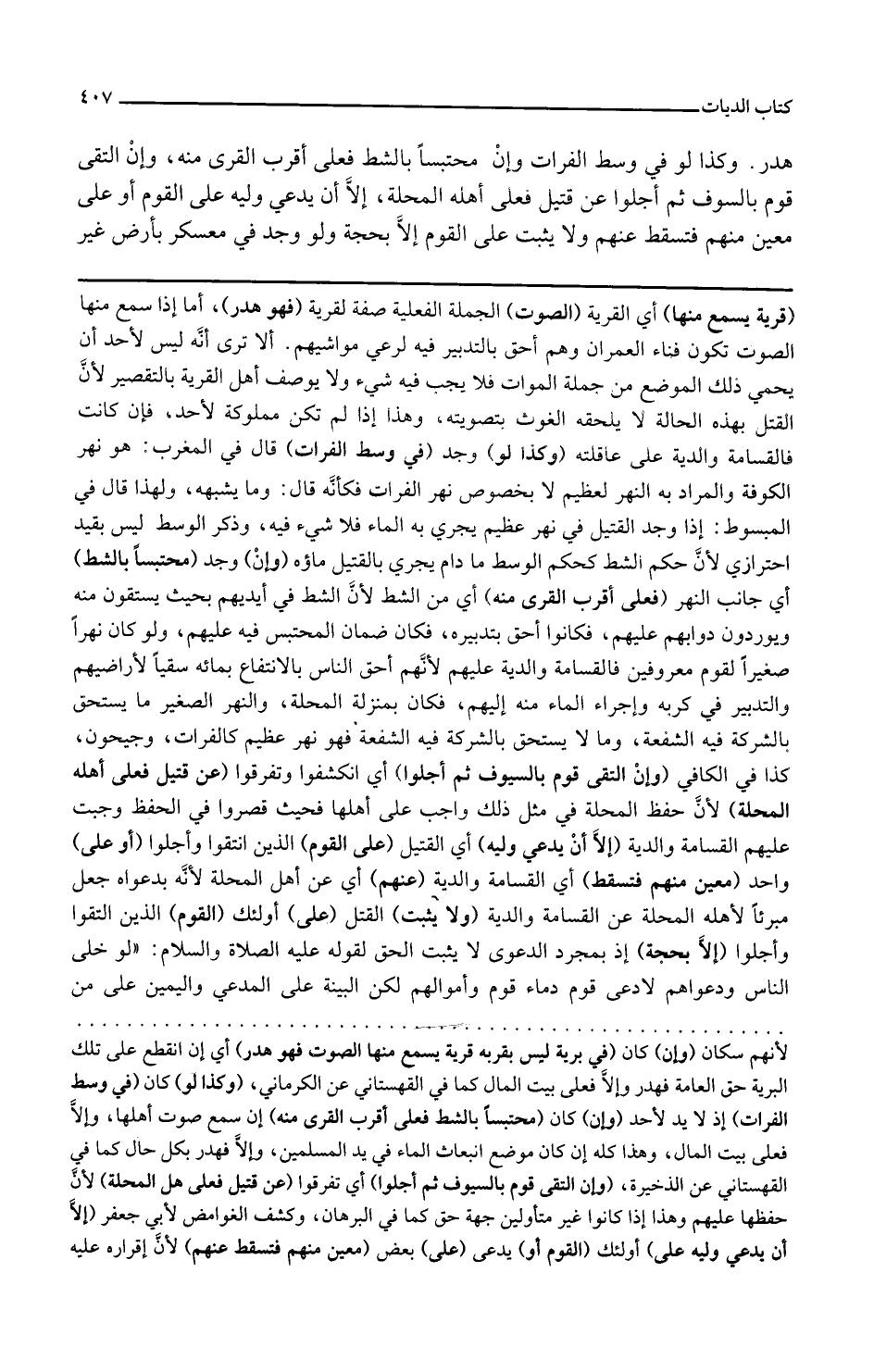 وإن وجد محتبسا بالشط أي جانب النهر فعلى أقرب القرى منه أي من الشط لأن الشط في أيديهم بحيث يستقون منه ويوردون دوابهم عليه فكانوا أحق بتدبيره فكان ضمان المحتبس فيه عليهم ولو كان نهرا صغيرا لقوم معروفين فالقسامة والدية عليهم لأنهم أحق الناس بالانتفاع بمائه سقيا لأراضيهم والتدبير في كريه وإجراء الماء منه إليهم فكان بمنزلة المحلة والنهر الصغير ما يستحق بالشركة فيه الشفعة وما لا يستحق بالشركة فيه الشفعة فهو نهر عظيم كالفرات وجيحون كذا في الكافي