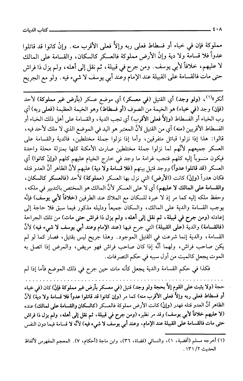 وإن كانت الأرض التي نزل بها العسكر مملوكة لأحد فالعسكر كالسكان والقسامة على المالك لا عليهم أي لا على العسكر لأن المالك هو المختص بالتدبير في ملكه وحفظ ملكه إليه كما مر إذ لا عبرة للسكان مع الملاك عند الطرفين خلافا لأبي يوسف فإنه يوجب القسامة والدية على المالك والسكان جميعا ودليله مذكور فيما سبق فلا حاجة إلى إعادته