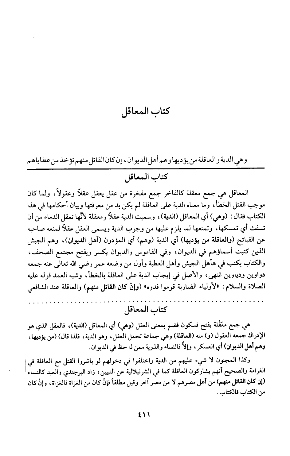 المعاقل هي جمع معقلة كالمفاخر جمع مفخرة من عقل يعقل عقلا وعقولا ولما كان موجب القتل الخطأ وما معناه الدية على العاقلة لم يكن بد من معرفتها وبيان أحكامها في هذا الكتاب فقال وهي أي المعاقل الدية وسميت الدية عقلا ومعقلة لأنها تعقل الدماء من أن تسفك أي تمسكها وتمنعها لما يلزم عليها من وجوب الدية ويسمى العقل عقلا لمنعه صاحبه عن القبائح والعاقلة من يؤديها أي الدية وهم أي المؤدون أهل الديوان وهم الجيش الذين كتبت أسماؤهم في الديوان