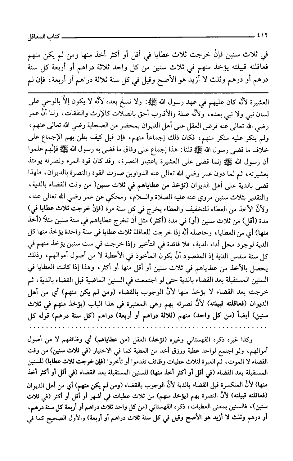 ومن لم يكن منهم أي من أهل الديوان فعاقلته قبيلته لأن نصرته بهم وهي المعتبرة في هذا الباب يؤخذ منهم في ثلاث سنين أيضا من كل واحد منهم ثلاثة دراهم أو أربعة دراهم كل سنة درهم قوله كل