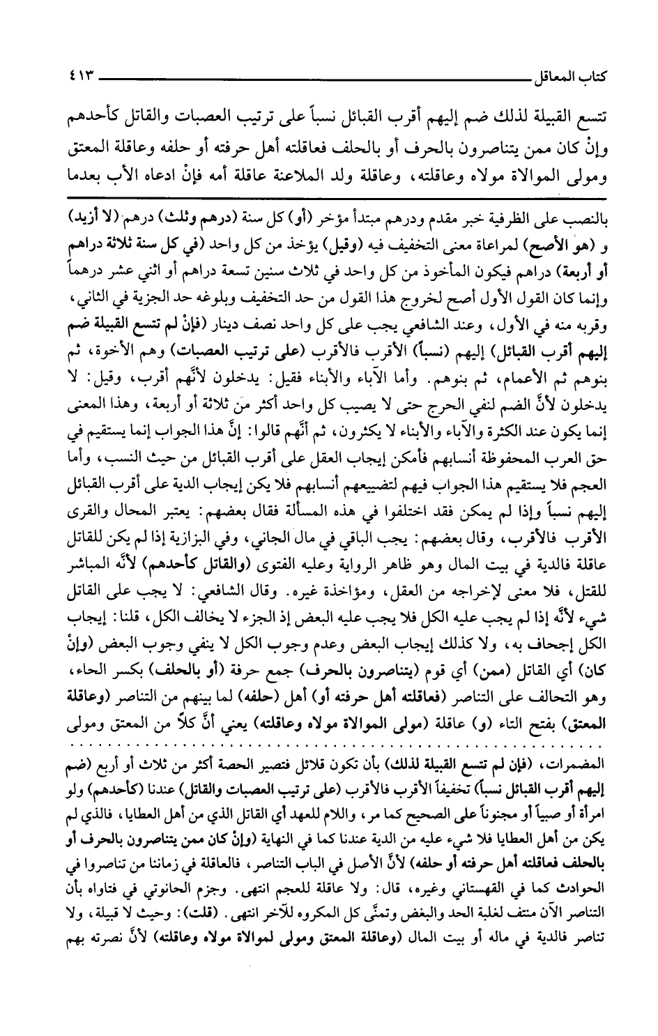 بالنصب على الظرفية خبر مقدم ودرهم مبتدأ مؤخر أو كل سنة درهم وثلث درهم لا أزيد و هو الأصح لمراعاة معنى التخفيف فيه وقيل يؤخذ من كل واحد في كل سنة ثلاثة دراهم أو أربعة دراهم فيكون المأخوذ من كل واحد في ثلاث سنين تسعة دراهم أو اثني عشر درهما وإنما كان القول الأول أصح لخروج هذا القول من حد التخفيف وبلوغه حد الجزية في الثاني وقربه منه في الأول وعند الشافعي يجب على كل واحد نصف دينار فإن لم تتسع القبيلة لذلك ضم إليهم أقرب القبائل إليهم نسبا الأقرب فالأقرب على ترتيب العصبات وهم الإخوة ثم بنوهم ثم الأعمام ثم بنوهم وأما الآباء والأبناء فقيل يدخلون لأنهم أقرب وقيل لا يدخلون لأن الضم لنفي الحرج حتى لا يصيب كل واحد أكثر من ثلاثة أو أربعة وهذا المعنى إنما يكون عند الكثرة والآباء والأبناء لا يكثرون ثم إنهم قالوا إن هذا الجواب إنما يستقيم في حق العرب المحفوظة أنسابهم فأمكن إيجاب العقل على أقرب القبائل من حيث النسب وأما العجم فلا يستقيم هذا الجواب فيهم لتضييعهم أنسابهم فلا يمكن إيجاب الدية على أقرب القبائل إليهم نسبا وإذا لم يمكن فقد اختلفوا في هذه المسألة فقال بعضهم يعتبر المحال والقرى الأقرب فالأقرب وقال بعضهم يجب الباقي في مال الجاني
