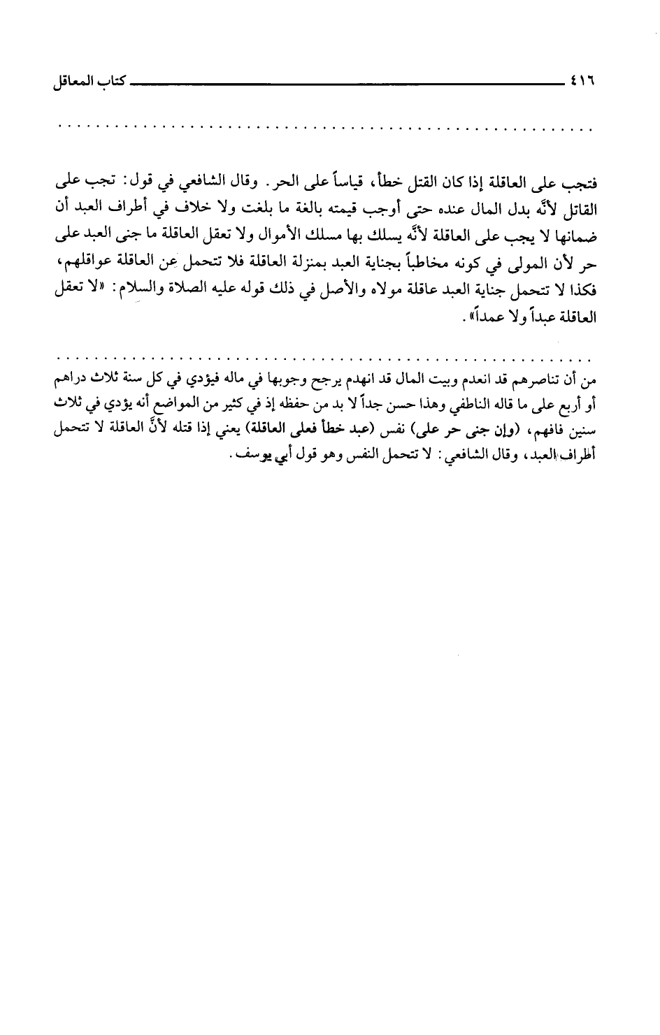 وقال الشافعي في قول تجب على القاتل لأنه بدل المال عنده حتى أوجب قيمته بالغة ما بلغت ولا خلاف في أطراف العبد إن ضمانها لا يجب على العاقلة لأنه يسلك بها مسلك الأموال ولا تعقل العاقلة ما جنى العبد على حر لأن المولى في كونه مخاطبا بجناية العبد بمنزلة العاقلة فلا تتحمل عن العاقلة عواقلهم فكذا لا تتحمل جناية العبد عاقلة مولاه والأصل في ذلك قوله عليه الصلاة والسلام لا تعقل العاقلة عبدا ولا عمدا