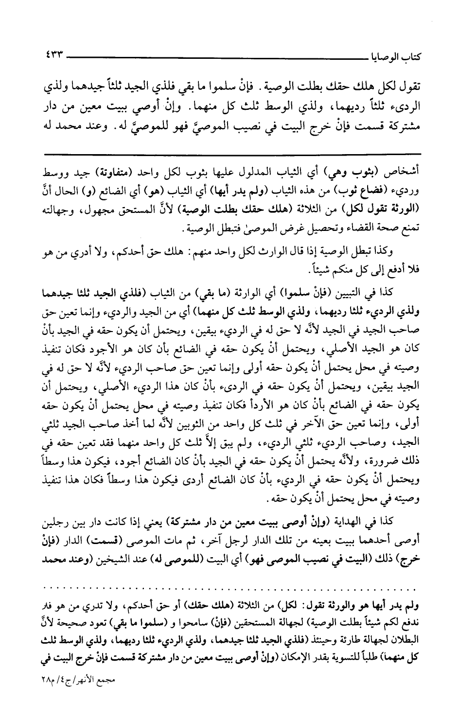 أشخاص بثوب وهي أي الثياب المدلول عليها بثوب لكل واحد متفاوتة جيد ووسط ورديء فضاع ثوب من هذه الثياب ولم يدر أيها أي الثياب هو أي الضائع و الحال أن الورثة تقول لكل من الثلاثة هلك حقك بطلت الوصية لأن المستحق مجهول وجهالته تمنع صحة القضاء وتحصيل غرض الموصي فتبطل الوصية وكذا تبطل الوصية إذا قال الوارث لكل واحد منهم هلك حق أحدكم ولا أدري من هو فلا أدفع إلى كل منكم شيئا كذا في التبين فإن سلموا أي الورثة ما بقي من الثياب فلذي الجيد ثلثا جيدهما ولذي الرديء ثلثا رديئهما ولذي الوسط ثلث كل منهما أي من الجيد والرديء وإنما تعين حق صاحب الجيد في الجيد لأنه لا حق له في الرديء بيقين ويحتمل أن يكون حقه في الجيد بأن كان هو الجيد الأصلي ويحتمل أن يكون حقه في الضائع بأن كان هو الأجود فكان تنفيذ وصيته في محل يحتمل أن يكون حقه أولى وإنما تعين حق صاحب الرديء لأنه لا حق له في الجيد بيقين ويحتمل أن يكون حقه في الرديء بأن كان هذا الرديء الأصلي ويحتمل أن يكون حقه في الضائع بأن كان هو الأردأ فكان تنفيذ وصيته في محل يحتمل أن يكون حقه أولى وإنما تعين حق الآخر في ثلث كل واحد من الثوبين لأنه لما أخذ صاحب الجيد ثلثي الجيد وصاحب الرديء ثلثي الرديء ولم يبق إلا ثلث كل واحد منهما فقد تعين حقه في ذلك ضرورة ولأنه يحتمل أن يكون حقه في الجيد بأن كان الضائع أجود فيكون هذا وسطا ويحتمل أن يكون حقه في الرديء بأن كان الضائع أردأ فيكون هذا وسطا فكان هذا تنفيذ وصيته في محل يحتمل أن يكون حقه