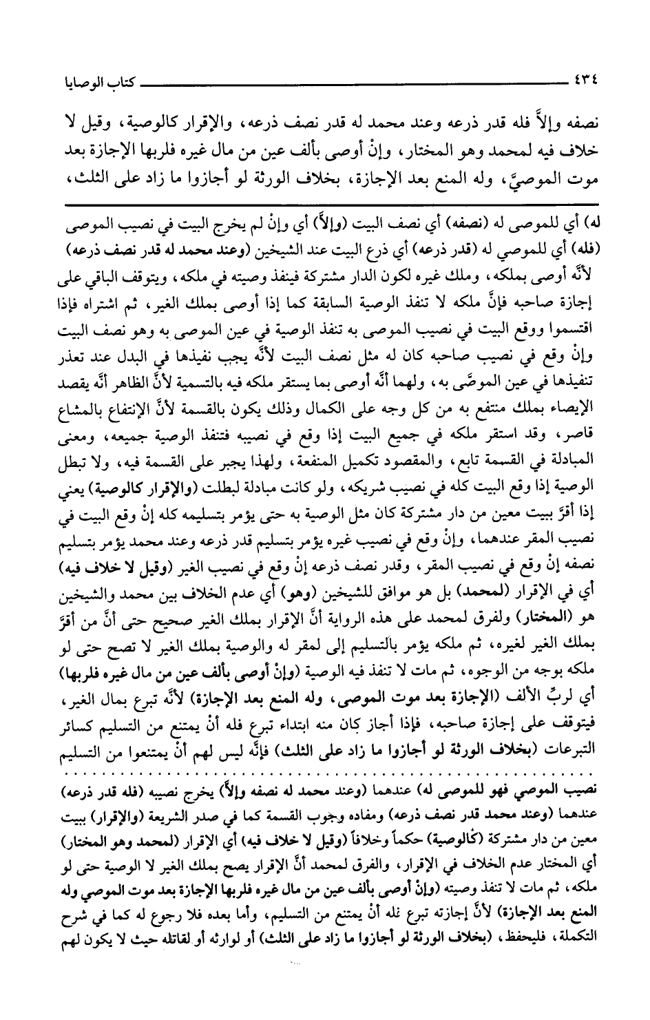 له أي للموصى له نصفه أي نصف البيت وإلا أي وإن لم يخرج البيت في نصيب الموصي فله أي للموصى له قدر ذرعه أي ذرع البيت عند الشيخين وعند محمد له قدر نصف ذرعه لأنه أوصى بملكه وملك غيره لكون الدار مشتركة فتنفذ وصيته في ملكه ويتوقف الباقي على إجازة صاحبه فإن ملكه لا تنفذ الوصية السابقة كما إذا أوصى بملك الغير ثم اشتراه فإذا اقتسموا ووقع البيت في نصيب الموصي به تنفذ الوصية في عين الموصى به وهو نصف البيت وإن وقع في نصيب صاحبه كان له مثل نصف البيت لأنه يجب تنفيذها في البدل عند تعذر تنفيذها في عين الموصى به ولهما أنه أوصى بما يستقر ملكه فيه بالتسمية لأن الظاهر أنه يقصد الإيصاء بملك منتفع به من كل وجه على الكمال وذلك يكون بالقسمة لأن الانتفاع بالمشاع قاصر وقد استقر ملكه في جميع البيت إذا وقع في نصيبه فتنفذ الوصية في جميعه ومعنى المبادلة في القسمة تابع والمقصود تكميل المنفعة ولهذا يجبر على القسمة فيه ولا تبطل الوصية إذا وقع البيت كله في نصيب شريكه ولو كانت مبادلة لبطلت والإقرار كالوصية يعني إذا أقر ببيت معين من دار مشتركة كان مثل الوصية به حتى يؤمر بتسليمه كله إن وقع البيت في نصيب المقر عندهما وإن وقع في نصيب غيره يؤمر بتسليم قدر ذرعه وعند محمد يؤمر بتسليم نصفه إن وقع في نصيب المقر وقدر نصف ذرعه إن وقع في نصيب الغير وقيل لا خلاف فيه أي في الإقرار لمحمد بل هو موافق للشيخين وهو أي عدم الخلاف بين محمد والشيخين هو المختار والفرق لمحمد على هذه الرواية أن الإقرار بملك الغير صحيح حتى أن من أقر بملك الغير لغيره ثم ملكه يؤمر بالتسليم إلى المقر له والوصية بملك الغير لا تصح حتى لو ملكه بوجه من الوجوه ثم مات لا تنفذ فيه الوصية