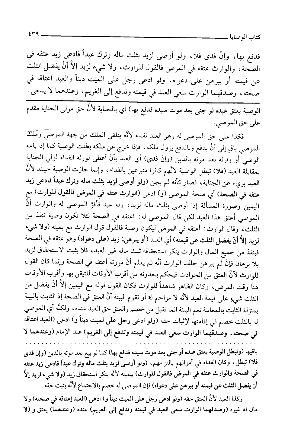 ولو أوصى لزيد بثلث ماله وترك عبدا فادعى زيد عتقه في الصحة أي صحة الموصي و ادعى الوارث عتقه في المرض فالقول للوارث مع اليمين وصورة المسألة إذا أوصى بثلث ماله لزيد وله عبد فأقر الموصى له والوارث أن الموصي أعتق هذا العبد لكن قال الموصى له أعتقه في الصحة لئلا تكون وصية تنفذ من الثلث وقال الوارث أعتقه في المرض ليكون وصية فالقول قول الوارث مع يمينه ولا شيء لزيد إلا أن يفضل الثلث عن قيمته أي العبد أو يبرهن زيد على دعواه وهو عتقه في الصحة فينفذ من جميع المال والوارث ينكر استحقاقه ثلث ماله غير العبد فلا يثبت الاستحقاق لزيد بلا برهان فإن لم يبرهن حلف الوارث أنه لم يعلم أن مورثه أعتقه في الصحة وإنما كان القول للوارث لأن العتق من الحوادث فيحكم بحدوثه من أقرب الأوقات للتيقن بها وأقرب الأوقات هنا وقت المرض وكان الظاهر شاهدا للوارث فكان القول قوله مع اليمين إلا أن يفضل من الثلث شيء على قيمة العبد لأنه لا مزاحم له أو تقوم البينة أن العتق في الصحة إذ الثابت بالبينة بمنزلة الثابت بالمعاينة نعم البينة إنما تقبل من خصم والعتق حق العبد عنده ولكنه أي الموصى له بالثلث خصم في إقامتها لإثبات حقه