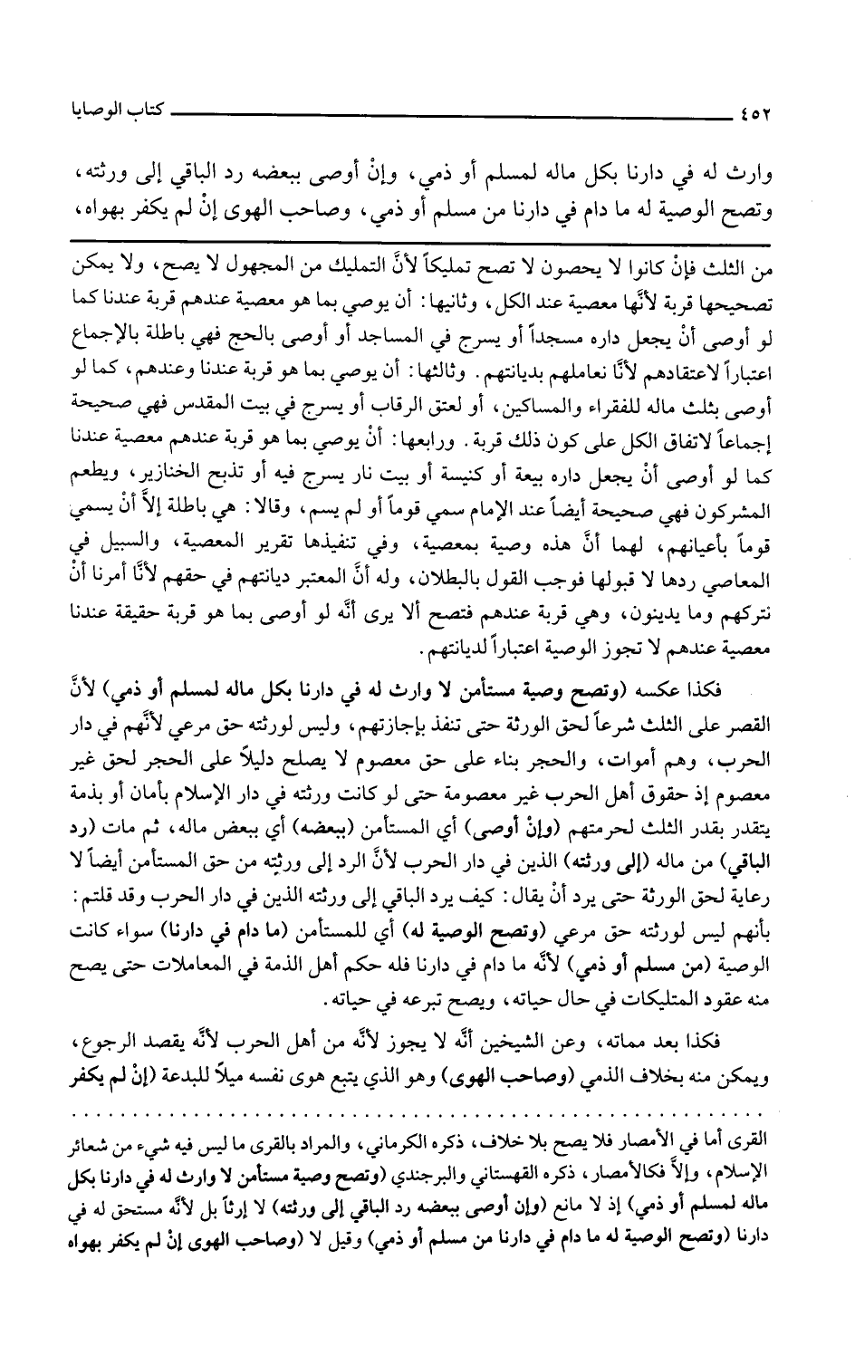 وتصح الوصية له أي للمستأمن ما دام في دارنا سواء كانت الوصية من مسلم أو ذمي لأنه ما دام في دارنا فله حكم أهل الذمة في المعاملات حتى يصح منه عقود التمليكات في حال حياته ويصح تبرعه في حياته فكذا بعد مماته وعن الشيخين أنه لا يجوز لأنه من أهل الحرب لأنه يقصد الرجوع ويمكن منه بخلاف الذمي وصاحب الهوى وهو الذي يتبع هوى نفسه ميلا للبدعة إن لم يكفر