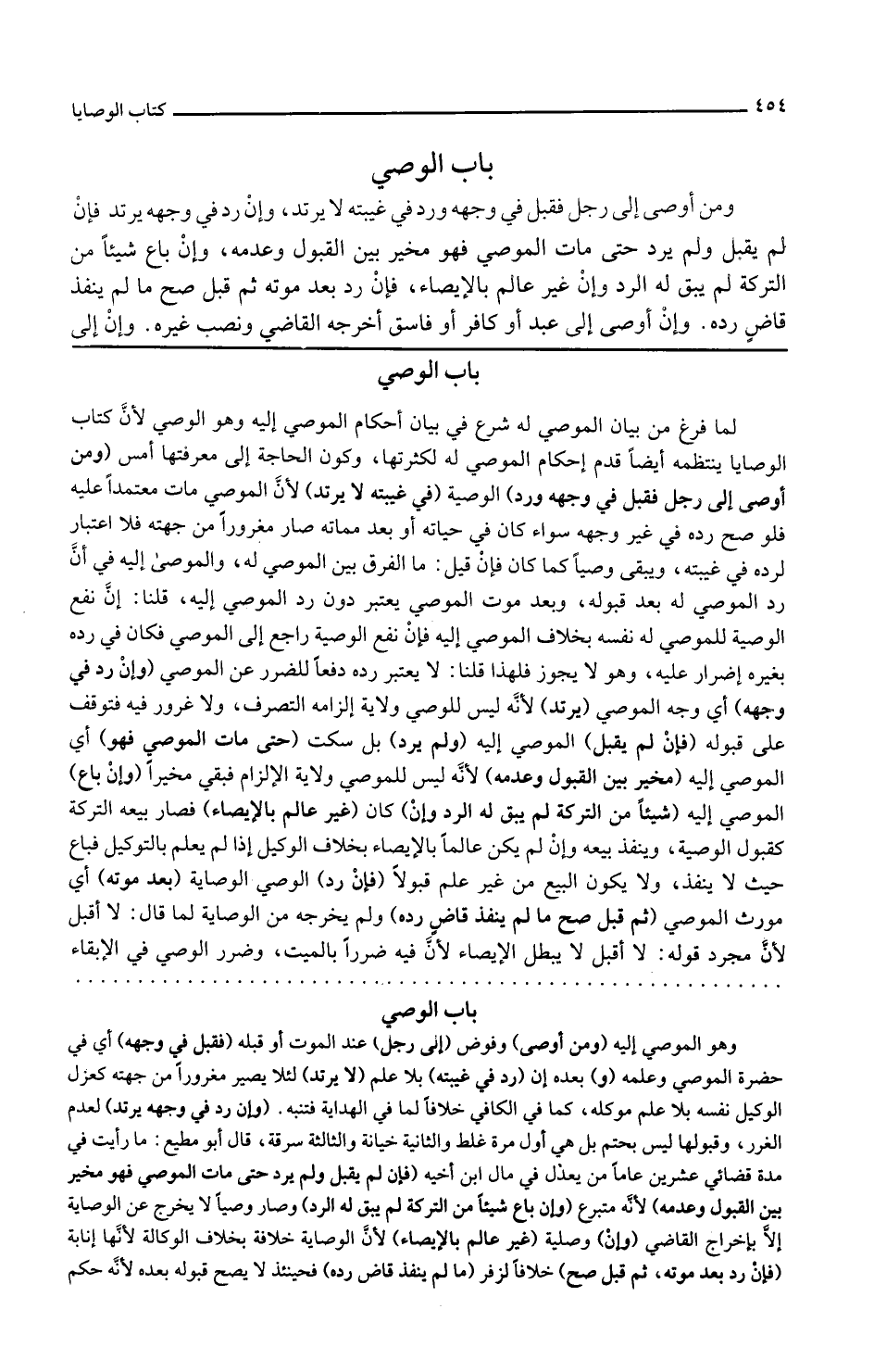 لما فرغ من بيان الموصى له شرع في بيان أحكام الموصى إليه وهو الوصي لأن كتاب الوصايا ينتظمه أيضا قدم أحكام الموصى له لكثرتها وكون الحاجة إلى معرفتها أمس ومن أوصى إلى رجل فقبل في وجهه ورد الوصية في غيبته لا يرتد لأن الموصي مات معتمدا عليه فلو صح رده في غير وجهه سواء كان في حياته أو بعد مماته صار مغرورا من جهته فلا اعتبار لرده في غيبته ويبقى وصيا كما كان فإن قيل ما الفرق بين الموصى له والموصى إليه في أن رد الموصى له بعد قبوله وبعد موت الموصي يعتبر دون رد الموصى إليه قلنا إن نفع الوصية للموصى له نفسه بخلاف الموصى إليه فإن نفع الوصية راجع إلى الموصي فكان في رده بغيره إضرار عليه وهو لا يجوز فلهذا قلنا لا يعتبر رده دفعا للضرر عن الموصي