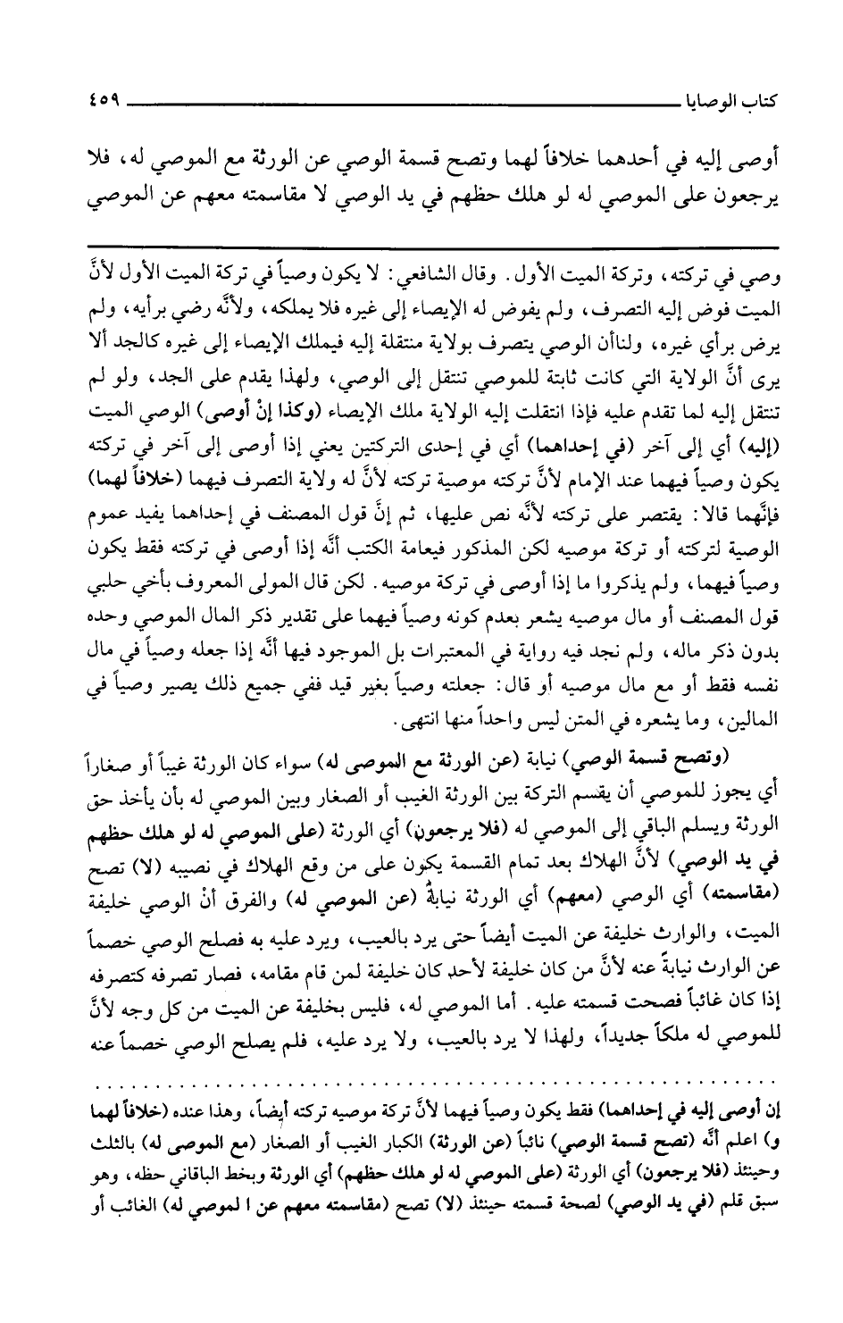 وتصح قسمة الوصي نيابة عن الورثة مع الموصى له سواء كان الورثة غيبا أو صغارا أي يجوز للموصي أن يقسم التركة بين الورثة الغيب أو الصغار وبين الموصى له بأن يأخذ حق الورثة ويسلم الباقي إلى الموصى له فلا يرجعون أي الورثة على الموصى له لو هلك حظهم في يد الوصي لأن الهلاك بعد تمام القسمة يكون على من وقع الهلاك في نصيبه لا تصح مقاسمته أي الوصي معهم أي الورثة نيابة عن الوصي له والفرق أن الوصي خليفة الميت والوارث خليفة عن الميت أيضا حتى يرد بالعيب ويرد عليه به فصلح الوصي خصما عن الوارث نيابة عنه لأن من كان خليفة لأحد كان خليفة لمن قام مقامه فصار تصرفه كتصرفه إذا كان غائبا فصحت قسمته عليه