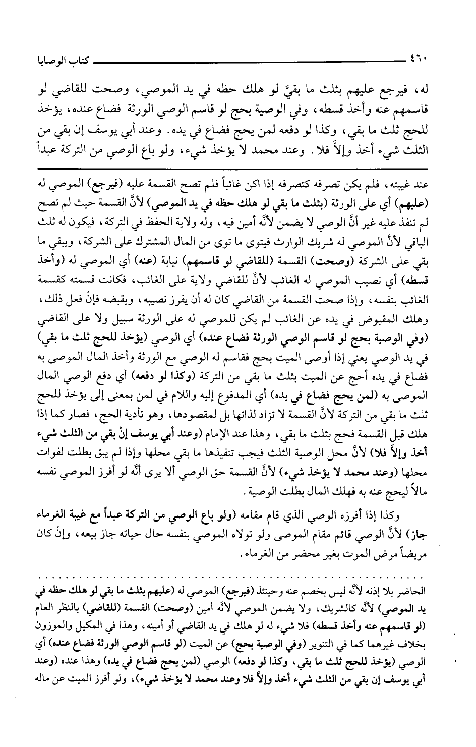عند غيبته فلم يكن تصرفه كتصرفه إذا كان غائبا فلم تصح القسمة عليه فيرجع الموصى له عليهم أي على الورثة بثلث ما بقي لو هلك حظه في يد الموصي لأن القسمة حيث لم تصح لم تنفذ عليه غير أن الوصي لا يضمن لأنه أمين فيه وله ولاية الحفظ في التركة فيكون له ثلث الباقي لأن الموصى له شريك الوارث فينوي ما نوى من المال المشترك على الشركة ويبقى ما بقي على الشركة وصحت القسمة للقاضي لو قاسمهم نيابة عنه أي الموصى له وأخذ قسطه أي نصيب الموصى له الغائب لأن للقاضي ولاية على الغائب فكانت قسمته كقسمة الغائب بنفسه وإذا صحت القسمة من القاضي كان له أن يفرز نصيبه ويقبضه فإن فعل ذلك وهلك المقبوض في يده عن الغائب لم يكن للموصى له على الورثة سبيل ولا على القاضي