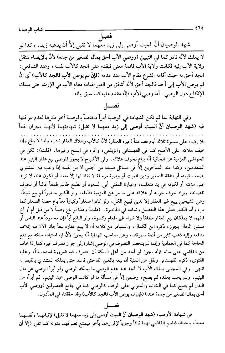 ووصي الأب أحق بمال الصغير من جده لأن بالإيصاء تنتقل ولاية الأب إليه فكانت ولاية الأب قائمة معنى فيقدم على الجد كالأب نفسه وعند الشافعي الجد أحق به حيث أقامه الشرع مقام الأب عند عدمه فإن لم يوص الأب فالجد كالأب أي إن لم يوص الأب إلى أحد فالجد أحق لأنه أشفق من الغير لقيامه مقام الأب في الإرث حتى يملك الإنكاح دون الوصي أما وصي الأب فإنه مقدم عليه كما سبق بيانه وفي النهاية لما لم تكن الشهادة في الوصية أمرا مختصا بالوصية أخر ذكرها لعدم عراقتها فيه
