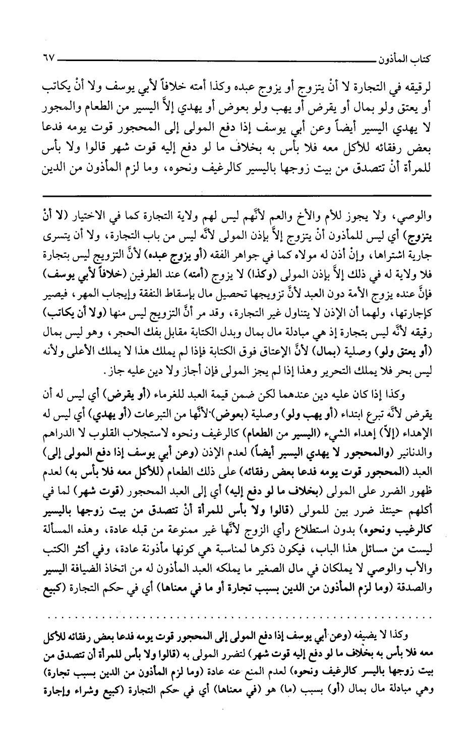 والوصي ولا يجوز للأم والأخ والعم لأنهم ليس لهم ولاية التجارة كما في الاختيار لا أن يتزوج أي ليس للمأذون أن يتزوج إلا بإذن المولى لأنه ليس من باب التجارة ولا أن يتسرى جارية اشتراها وإن أذن له مولاه كما في جواهر الفقه أو يزوج عبده لأن التزويج ليس بتجارة فلا ولاية له في ذلك إلا بإذن المولى